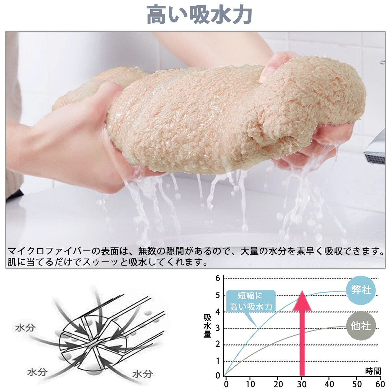 【驚いた吸水力】マイクロファイバー素材の表面は数えられない隙間があり、その隙間に水分をすばやく吸収、拡散します。拭かず、髪や肌にそっと当てるだけで水分がサラッと吸収されます。