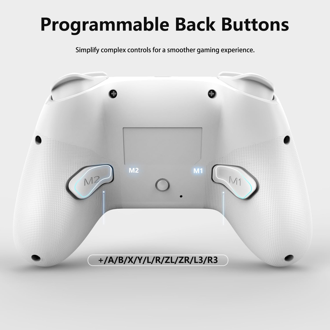 【6軸ジャイロセンサー&マクロ機能ボタン】高感度の6軸ジャイロセンサーを搭載し、傾きや動きを正確に感知します(※PC接続時は非対応)。視点移動や傾き操作が容易になり、より良いゲーム体験を提供します。また、Switchコントローラーの背面にはM1、M2ボタンがあり、マクロプログラミング機能をサポート。これらのボタンは、A/B/X/Y/L1/L2/R1/R2/ZL/ZR/L3/R3/上/下/左/右などで設定でき、連続技や必殺技を一発で発動可能です。