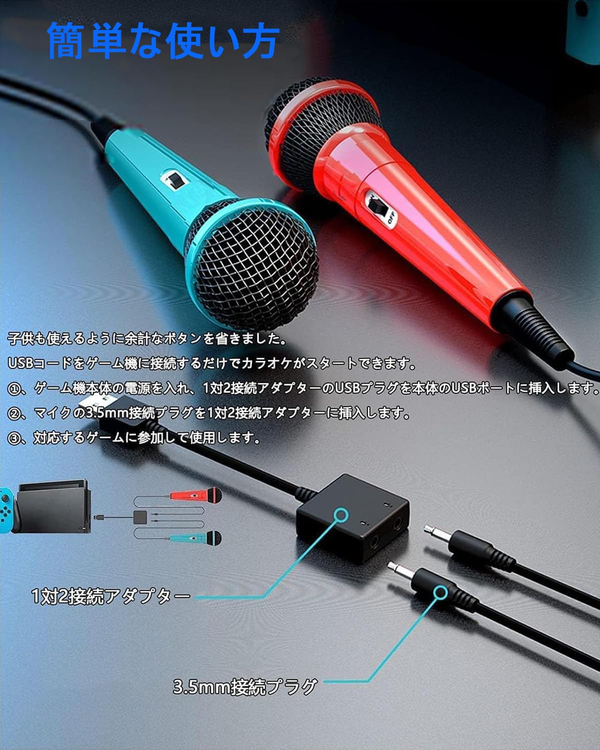 【簡単な使い方】子供も使えるように余計なボタンを省きました。USBコードをゲーム機に接続するだけでカラオケがスタートできます。①、ゲーム機本体の電源を入れ、1対2接続アダプターのUSBプラグを本体のUSBポートに挿入します。②、マイクの3.5mm接続プラグを1対2接続アダプターに挿入します。③、対応するゲームに参加して使用します。