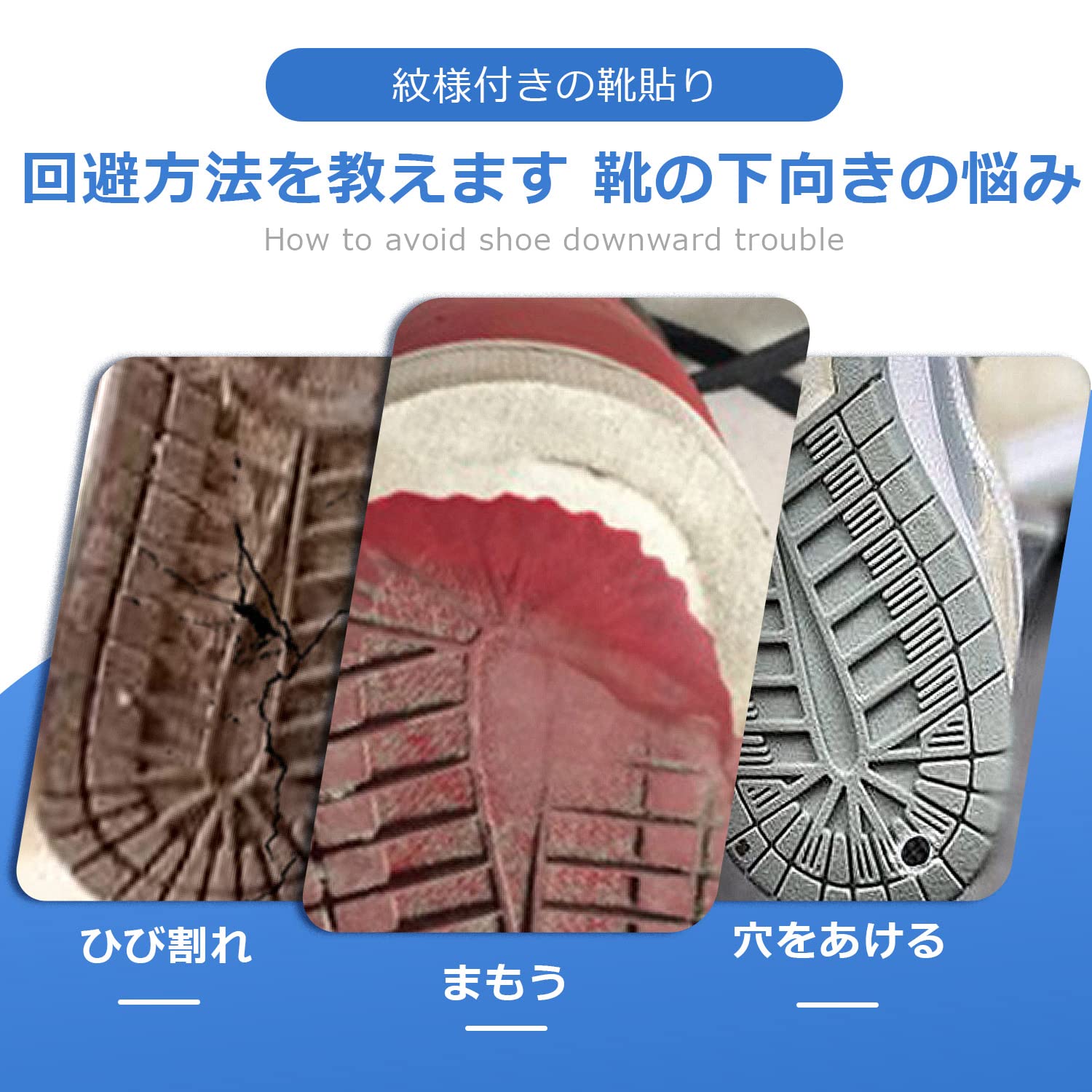 【靴底修理キット商品仕様】3ペア6枚セット(シーリング接着剤別売り)。素材:ゴム。色:ブラック、透明、ブルー、レッド。23.5cmから28.0cm幅広いサイズに対応しており、靴に合わせて簡単に調整できます。靴底や革靴、スニーカーの修理やかかとの修復にも適しており、摩耗した場合には新しいものに交換することもできます。