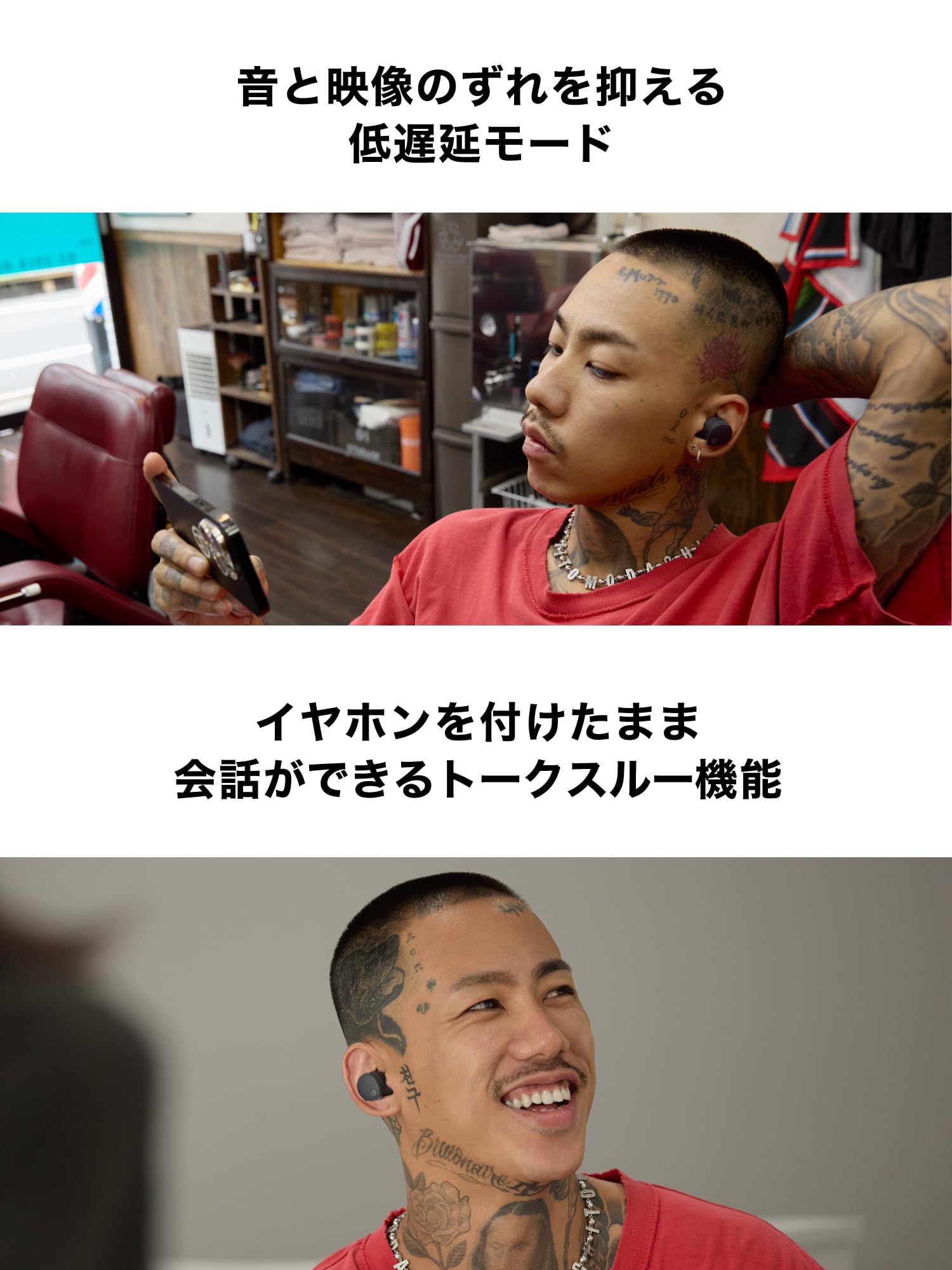 外音取込のヒアスルー機能とトークスルー機能:音楽を流しながら散歩やスポーツ、家事やテレワークをする際や、電車やバスでの通勤・通学時に周囲の音を気にしながらリスニングしたいときに便利です。