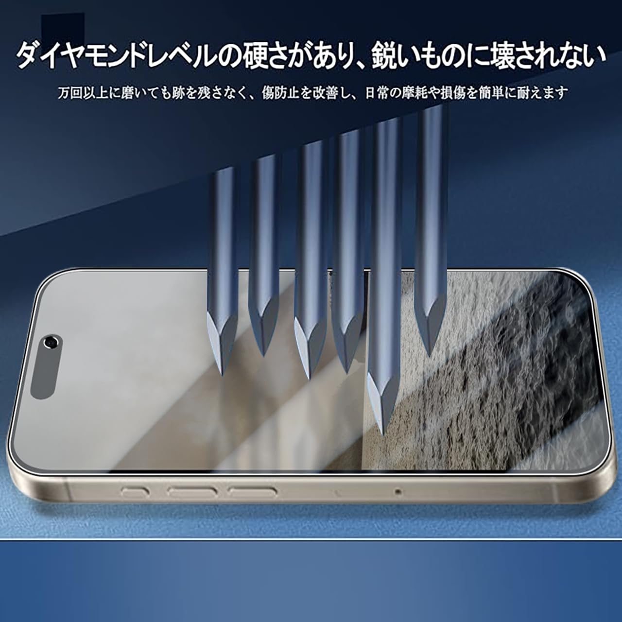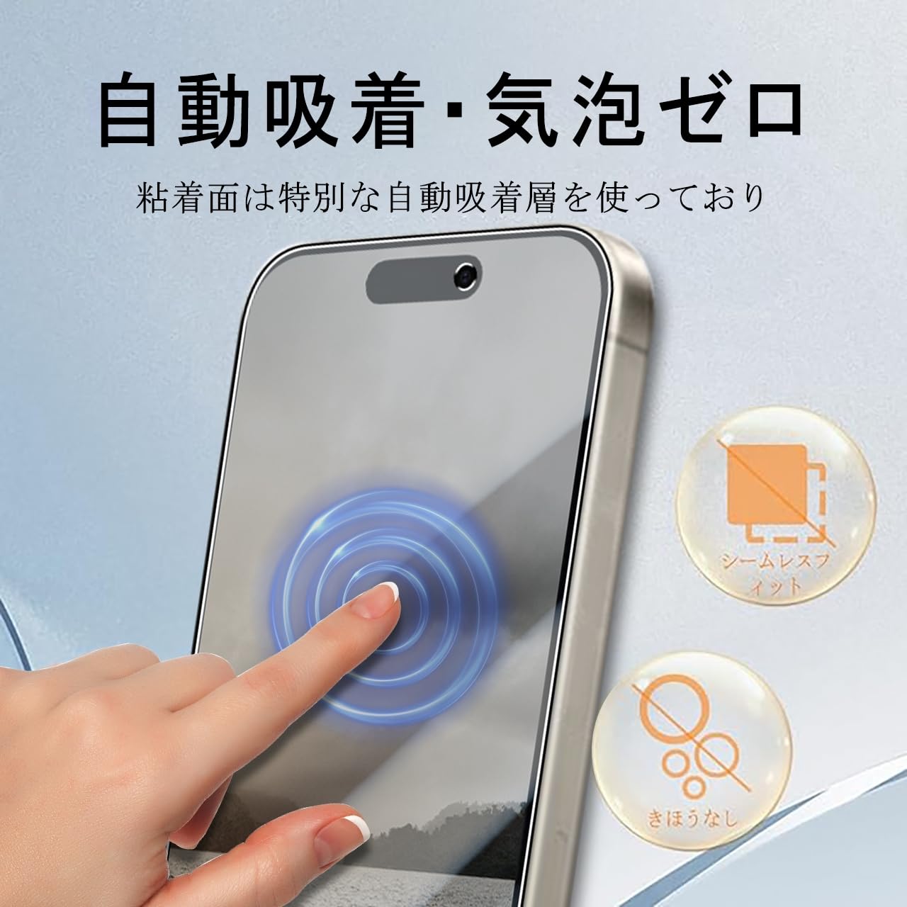 【2枚覗き見防止フィルム+2枚レンズ保護+ガイド枠】対応 iphone16 Pro Max ガラスフィルム 横から見えない フィルム 覗き見防止【 日本旭硝子製 強化ガラス 液晶 保護フィルム 硬度9H 耐衝撃 飛散防止 3D Touch対応 高感度タッチ 指紋防止 撥油性 疎水性 自動吸着 気泡ゼロ 貼り付け簡単】【国産旭硝子AGC素材の採用】:420℃の高温硬化処理と二次強化を6時間行って、弊社製品の強さは普段の商品と比べて5倍以上があり、液晶画面をしっかりと保護しますかぎやナイフなどの鋭いものに触れても傷しにくいですそして二次強化した後の旭硝子材質は靭性が高くて割れにくいです更にガラスの表面に防爆PET層を増やして、衝撃されても割れたら飛散しなく、特殊な飛散防止設計により、万一割れてしまった際にも飛散することなく、高い安全性を実現します本体に圧倒的なフィット感も実現していますすり傷や指紋からもスクリーンをしっかりと保護します 【貼り付け簡単、防水、油防止、指紋防止】:グレードアップしたイオン自働吸着技術を採用して、初心者でもたった3ステップ、10秒で簡単に綺麗で貼り付けることができます失敗の発生を防ぐことができて、ご心配を完全に解消しますそうすれば、フィルムの貼り付けが苦手な方でも簡単に貼れます耐用性が高い防汚コーティングで、指紋や汚れが付きにくいです指紋・油分・水分・汚れなどがつきにくくなります画面に汗、油、化粧品などがついても、簡単にふくだけで取れます【指紋認証設定手順】保護フィルムを貼り付けた後、指紋を再入力する必要がありますそうすれば、指紋認証と解除機能が実現できます 【透過率99%・心地よい肌触り】:ガラスフィルムを貼ったせいで指のすべりが悪くなってしまったり感度が悪くなってしまったりしたら、スマホの機能性が下がってしまいますね丶このガラスフィルムはつるつるな滑り感を実現液晶画面保護ガラスフィルムを改善した後、約99%の高透過率に達し、もっと高い透過率及び、超クリアな視覚体験を実現しますそして耐用性が高い撥油コーティングし、滑らかで快適な肌触りがあり、快適な操作性が長く持ちます普通のフィルムのようなざらざらしたタッチ感がまったくなく、指がスムーズにスライドすることができるので、ゲームプログラムに最適、液晶画面の鮮明さを影響しなく、画面本来の美しさをそのまま再現します 【アフターサービス】:私たちは製品にとても自信を持っていますが、万が一「割れ」「サイズ違い」「初期不良」等ございましたら、ご遠慮なくご連絡ください連絡先:「カスタマーサービス」に入り、「注文記録」ー「販売者」カスタマーサービスに「質問」してくださいお気軽にご相談ください私たちはオンラインで最高のサービスを提供します安心して購入してください