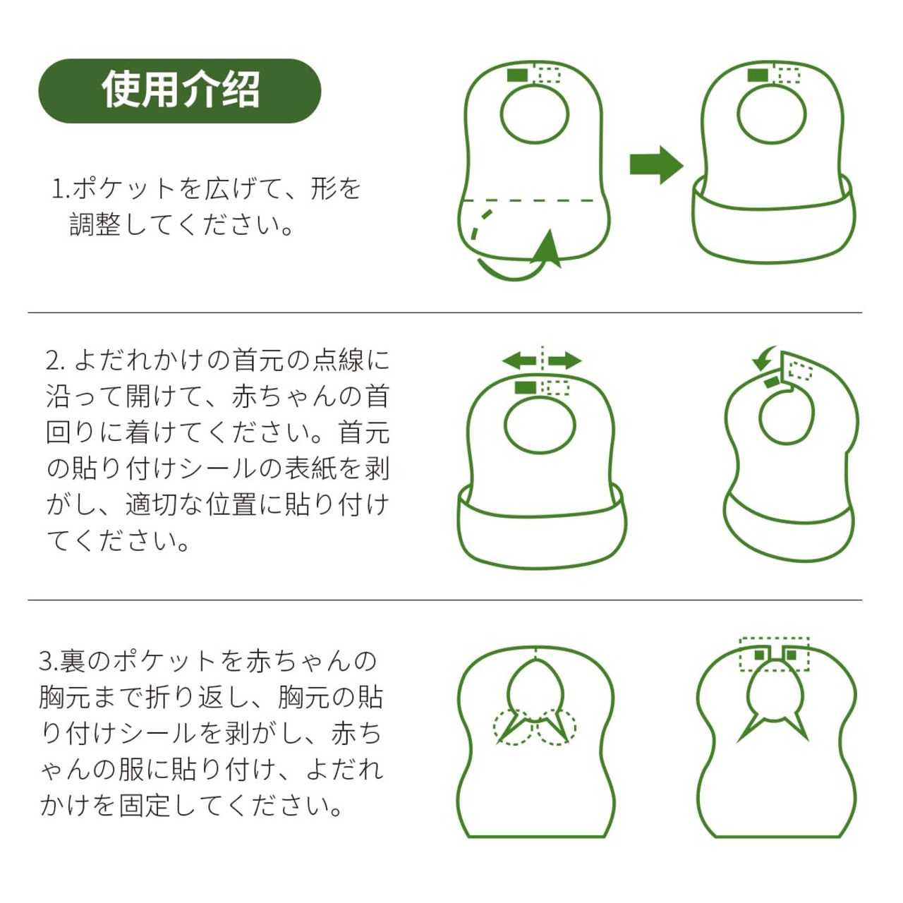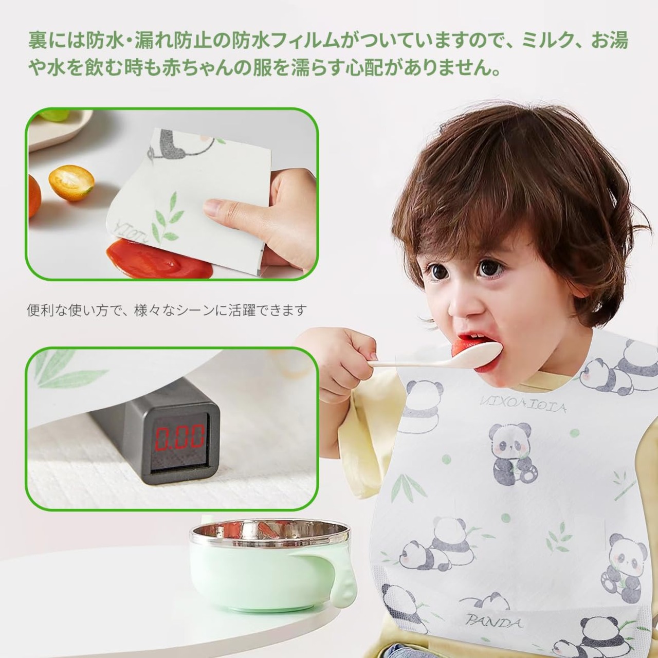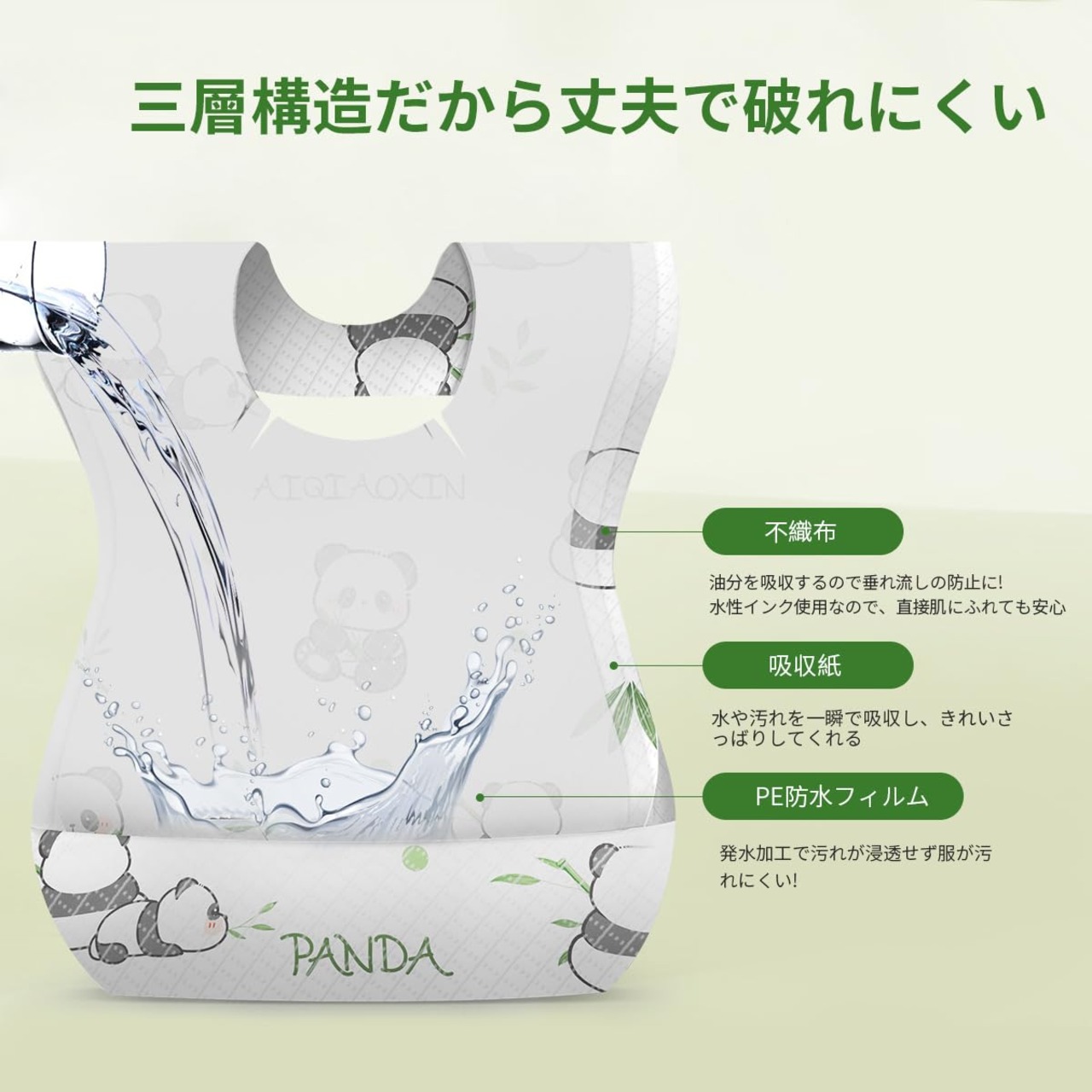 【肌に優しい不織布】私たちの使い捨てエプロンは多層エコファブリックで構成されています。 1層目はマスクレベルの肌にやさしい不織布、中はポリマー吸収層、裏面はPE通気漏れ防止裏地。 赤ちゃんの服を清潔にドライに保ちます。