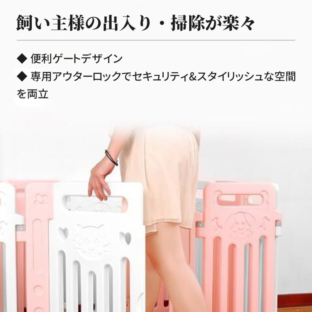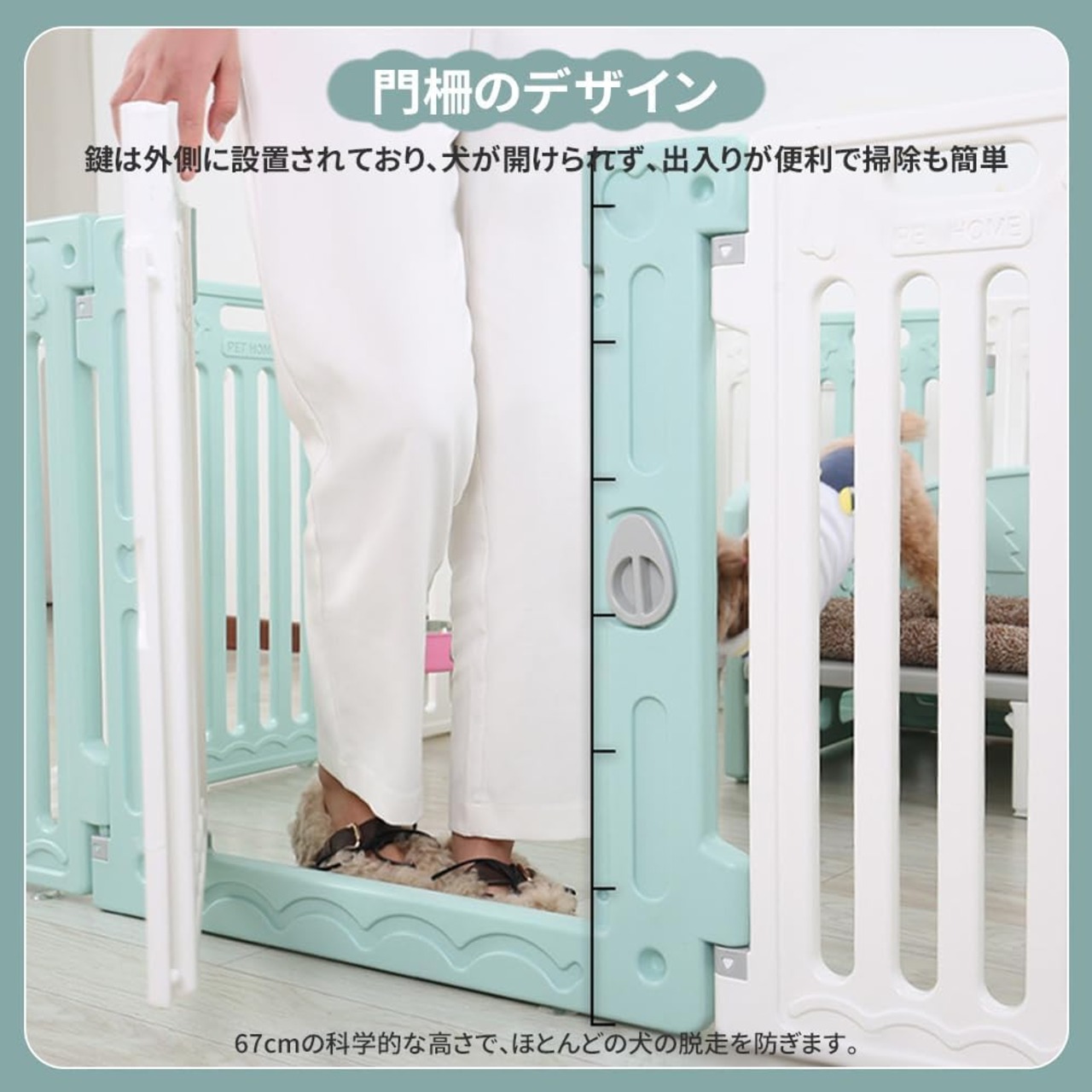 【自由に組み合わせサークル】スペースに合わせて8つのパネルを活かして、長方型、正方型、八角型、L字型などに変更できます。ペットフェンスは耐用性が優れるPEで製作されます、長時間使用可能です。ペットに安全で丈夫な遊びゾーンを提供いたします。窮屈な思いをさせる事なく、日常のトイレ訓練やハウストレーニングににもお勧めです。