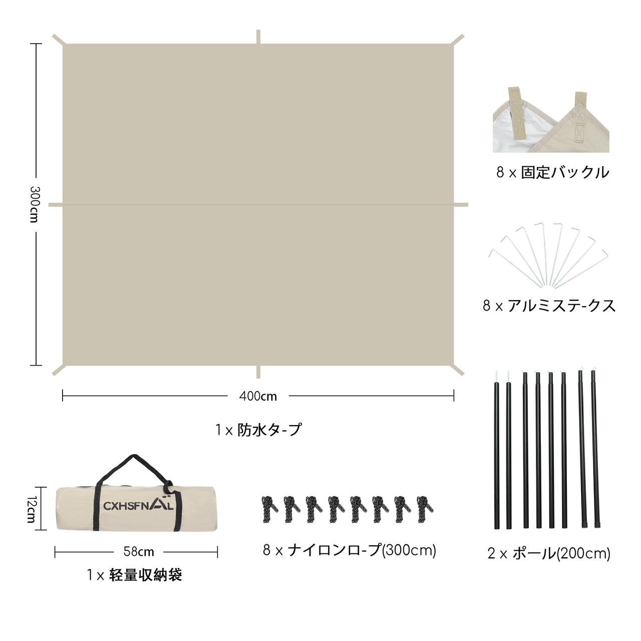 【サイズ】:展開時は約300x400cm、収納時は(約)58cmx12cmX12cmコンパクトサイズに抑えられます。グロメット8箇所が配置されて四角く大型なので広いリビングスペースのバリエーションにアレンジ出来ます。大型なので、3-6人の場合にお勧めです。【ご注意】本製品にポールは付属しません。別途を買い求めください。