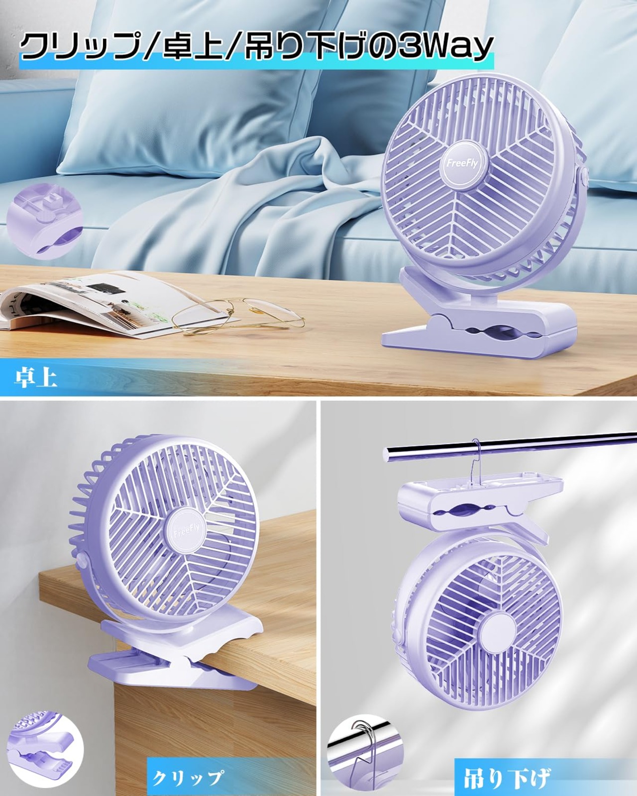 【10000mAh電池内蔵】FreeFly 充電式クリップ扇風機 卓上扇風機 直径約10CM羽根 14cm大型ファン搭載 風量3段階調整 Type-C・USB-A端子搭載 360度角度調整 デスク・リビング・野外など