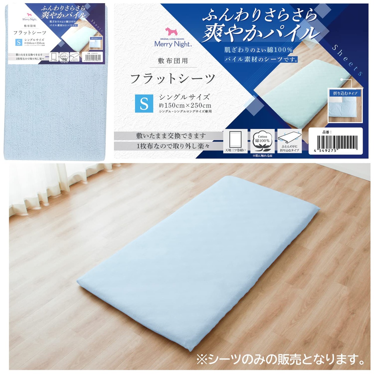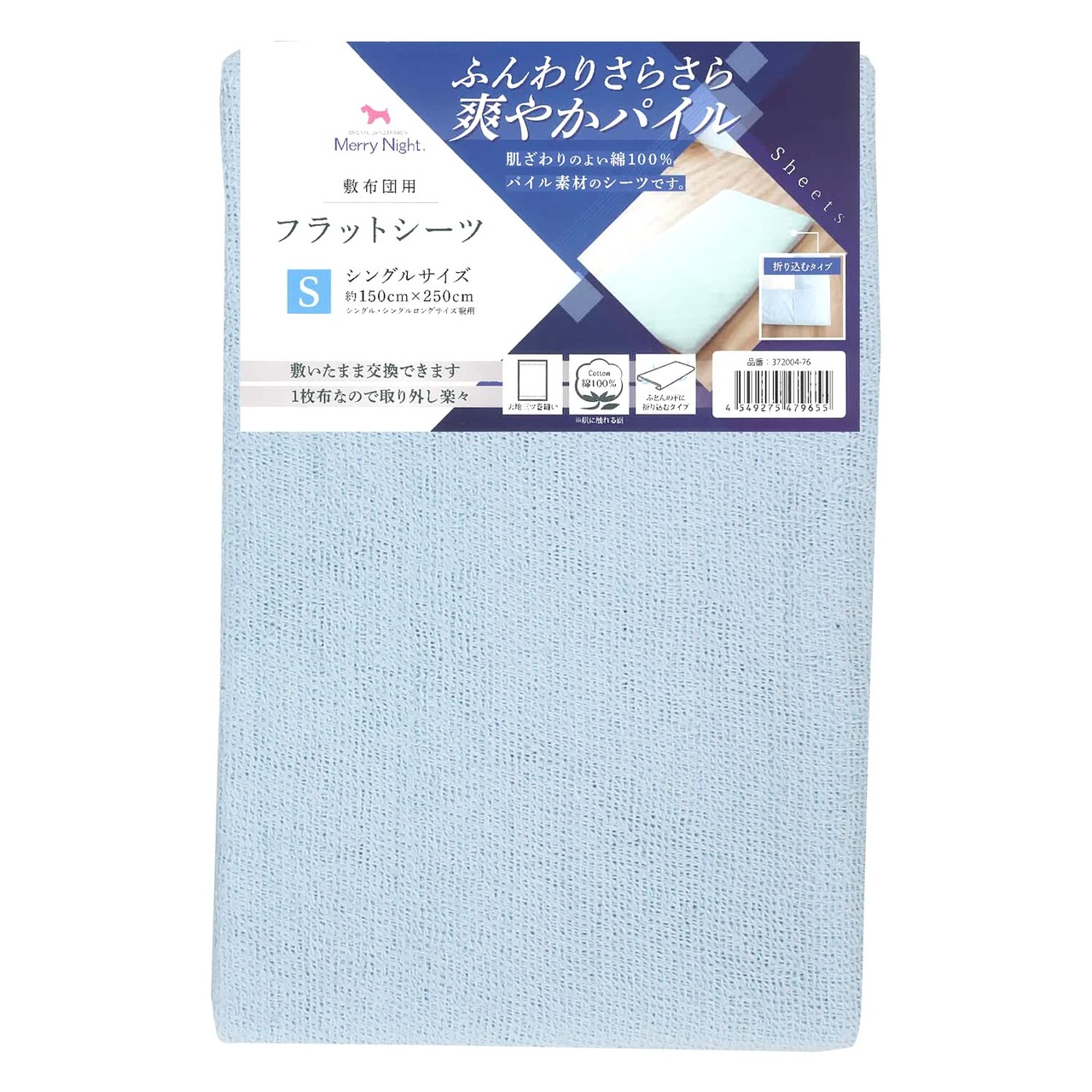 メリーナイト シーツ フラットシーツ パイル生地 ブルー 敷布団用 シングル 約150×250cm 綿100% ふんわりさらさら肌ざわり 洗える オールシーズン 372004-76