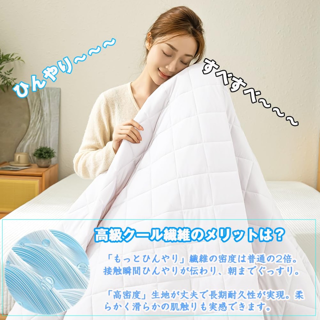 「極上の肌触りを実現する高密度冷感繊維を採用。」1本1本の繊維にまでこだわった特殊編み上げ技術で、従来品比200%の耐久性を実現しながら、表面はシルクのようなソフトでなめらかな滑りを追求しました。光沢感のある生地とパール加工糸を組み合わせることで、ベッドルームの雰囲気をグレードアップさせる洗練されたデザインです。抗菌防臭防ダニ加工でアレルギー体質の方やお子様も安心してご使用いただけます。