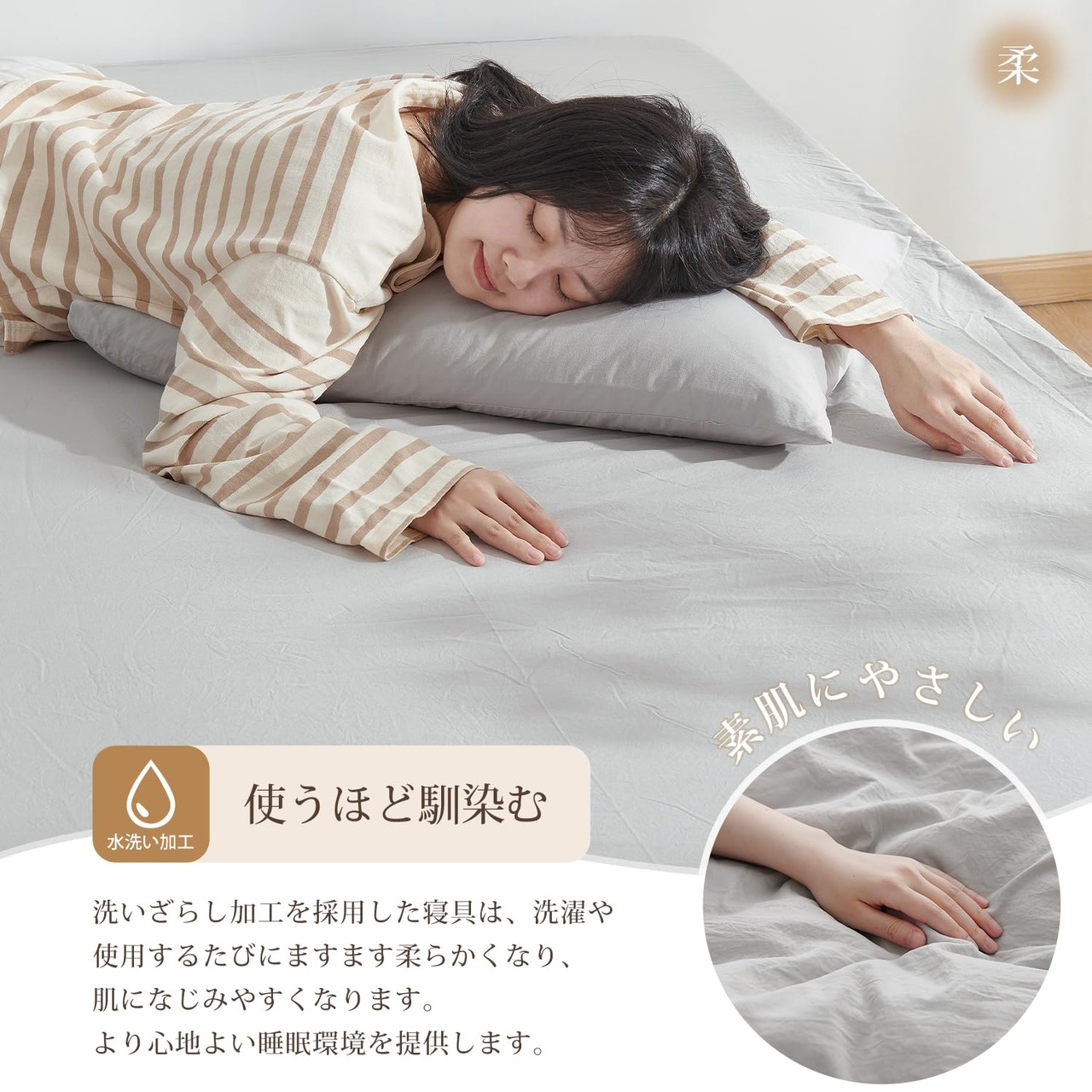 <洗いざらし&超柔らか肌触り>: 洗いざらしとは何度も洗って風合いが自然になったもの。お使いいただく初めから自然な風合いや、やわらかな肌触りを楽しめるように「洗い加工」を施しています。この加工を施した寝具は、洗濯や使用するごとにさらに柔らかくなり、肌馴染みも良くなります。