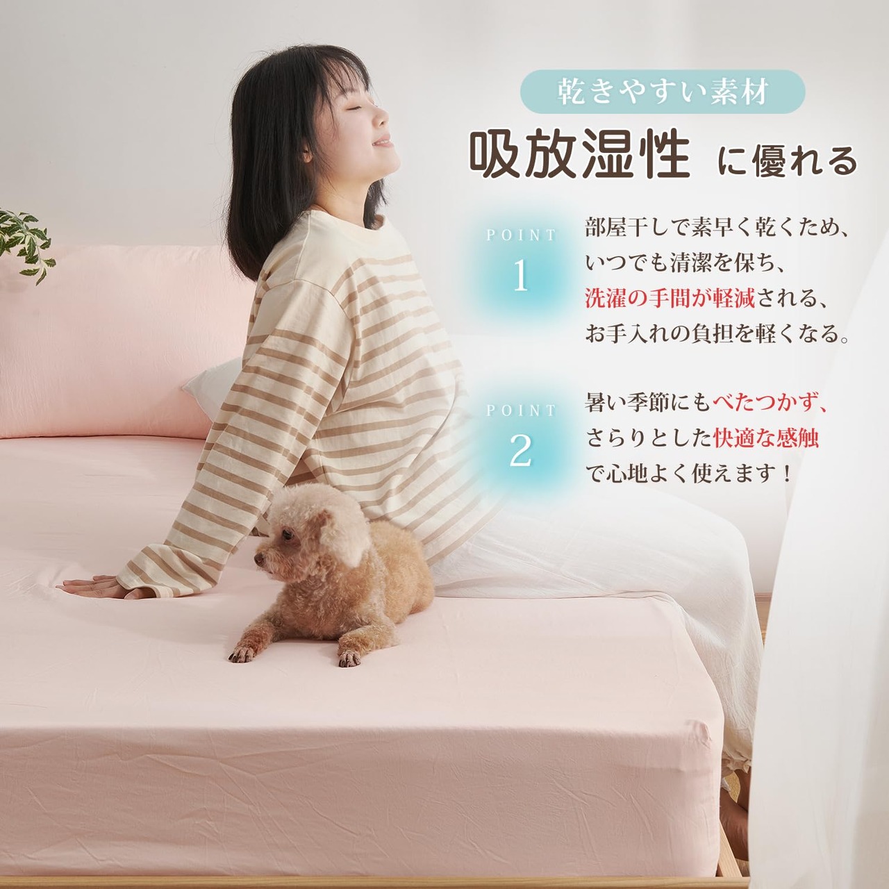 <通気性と速乾性>: 通気性が高いため、寝具の中で湿気がこもりにくく、快適な寝心地を提供してくれます。このボックスシーツは速乾性も優れています。洗濯後に素早く乾くため、洗濯の手間を軽減できますし、清潔さを保ちやすくなります。