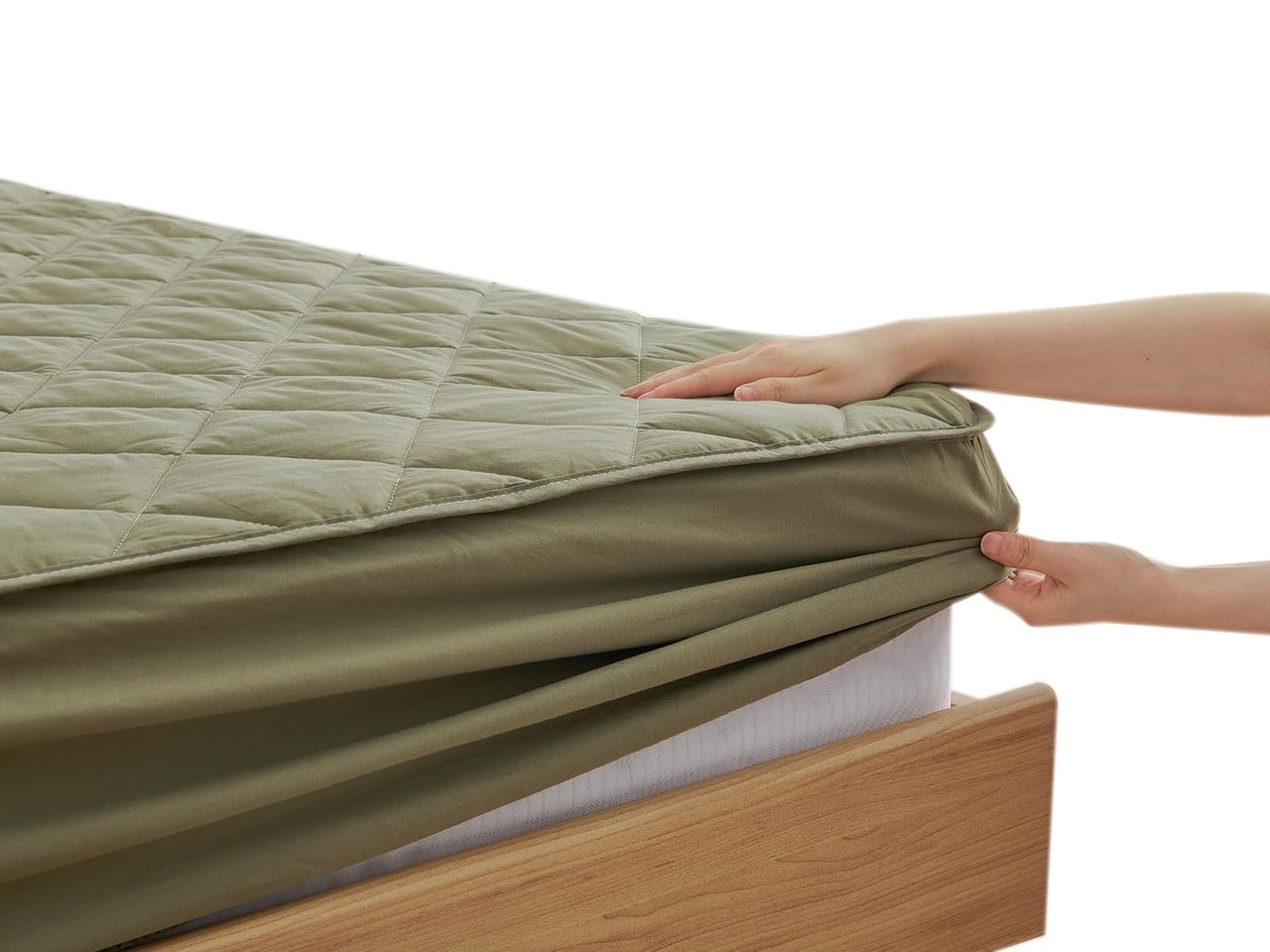 「ベッドパッドとボックスシーツが合体した」ほどよい厚みの中綿を充填して、ふんわり心地よい寝心地を実現しました。普通のボックスシーツより厚くて、柔らかさと反発性を兼ね備えたパッド一体型ボックスシーツです。
