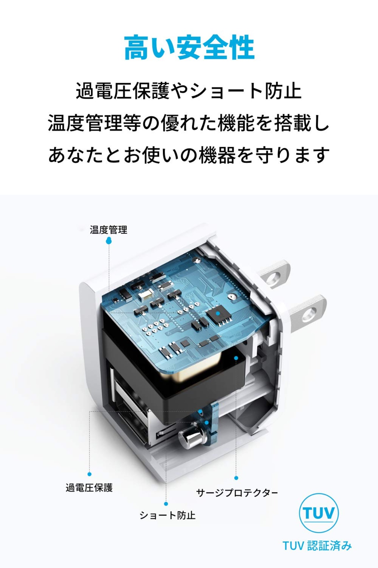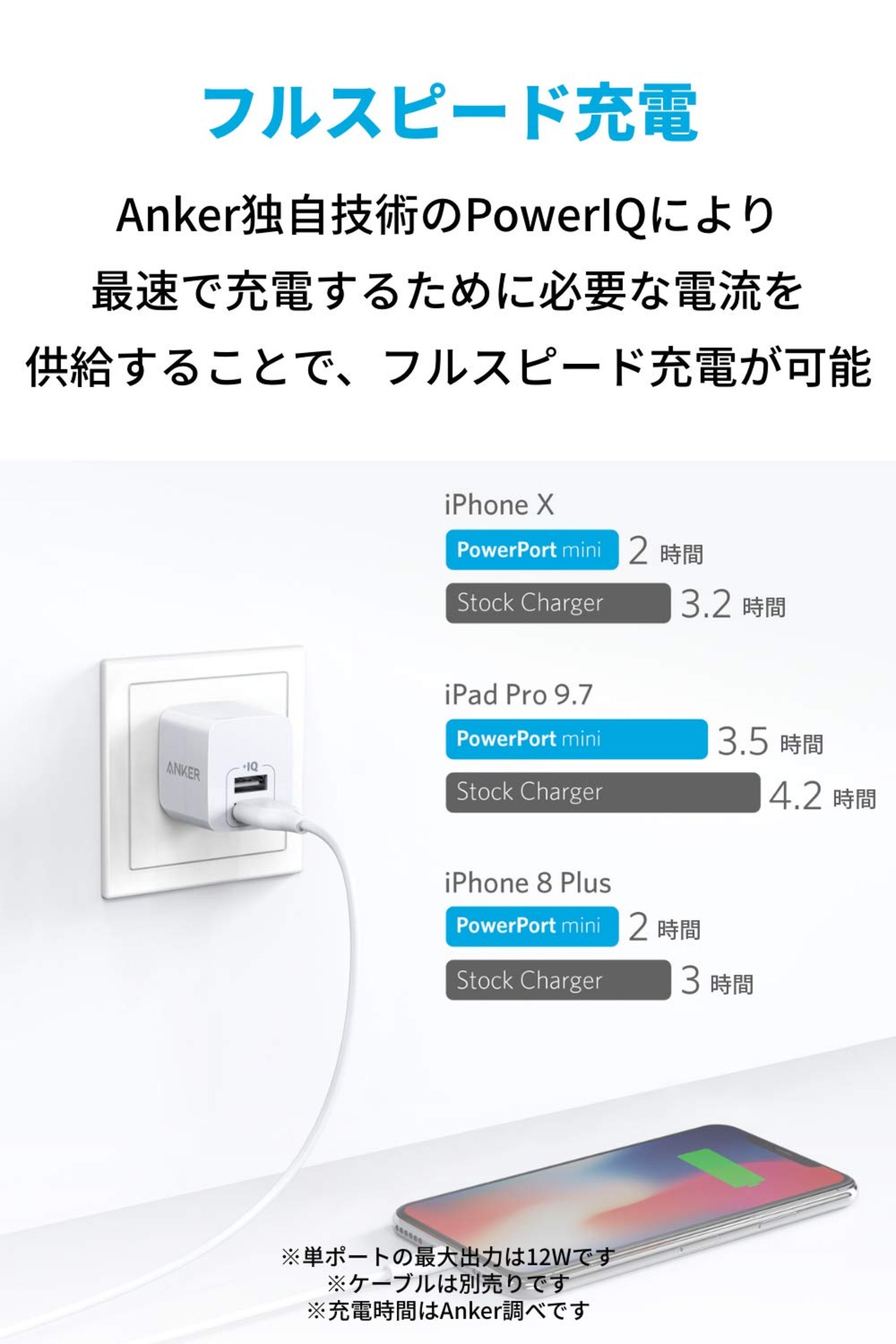 フルスピード充電技術:Anker独自のPowerIQにより、フルスピード充電が可能です(タブレット端末等、2A以上の入力に対応する機器を2台同時に充電する場合、充電速度が遅くなる場合があるため、「Anker PowerPort 2 Elite」をご利用ください)。