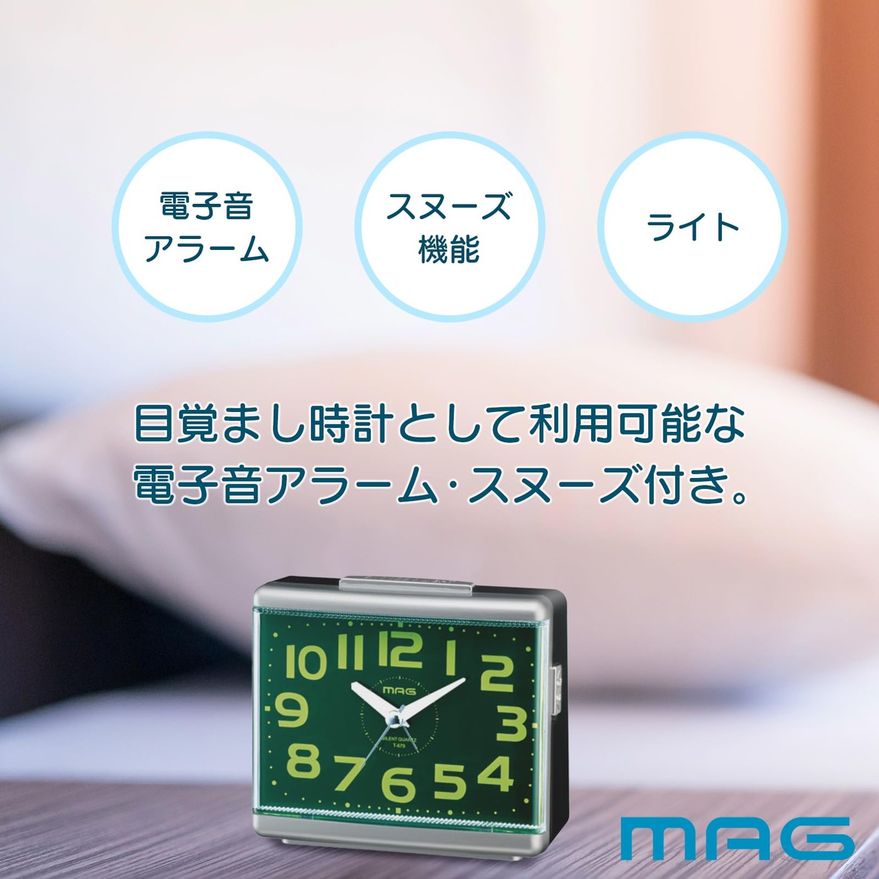 【特価商品】MAG(マグ) 目覚まし時計 置き時計 アナログ 見やすい 静音 連続秒針 電子音 アラーム スヌーズ ライト シルバー グッドモーニング2号 T-679 SM-Z ノア精密