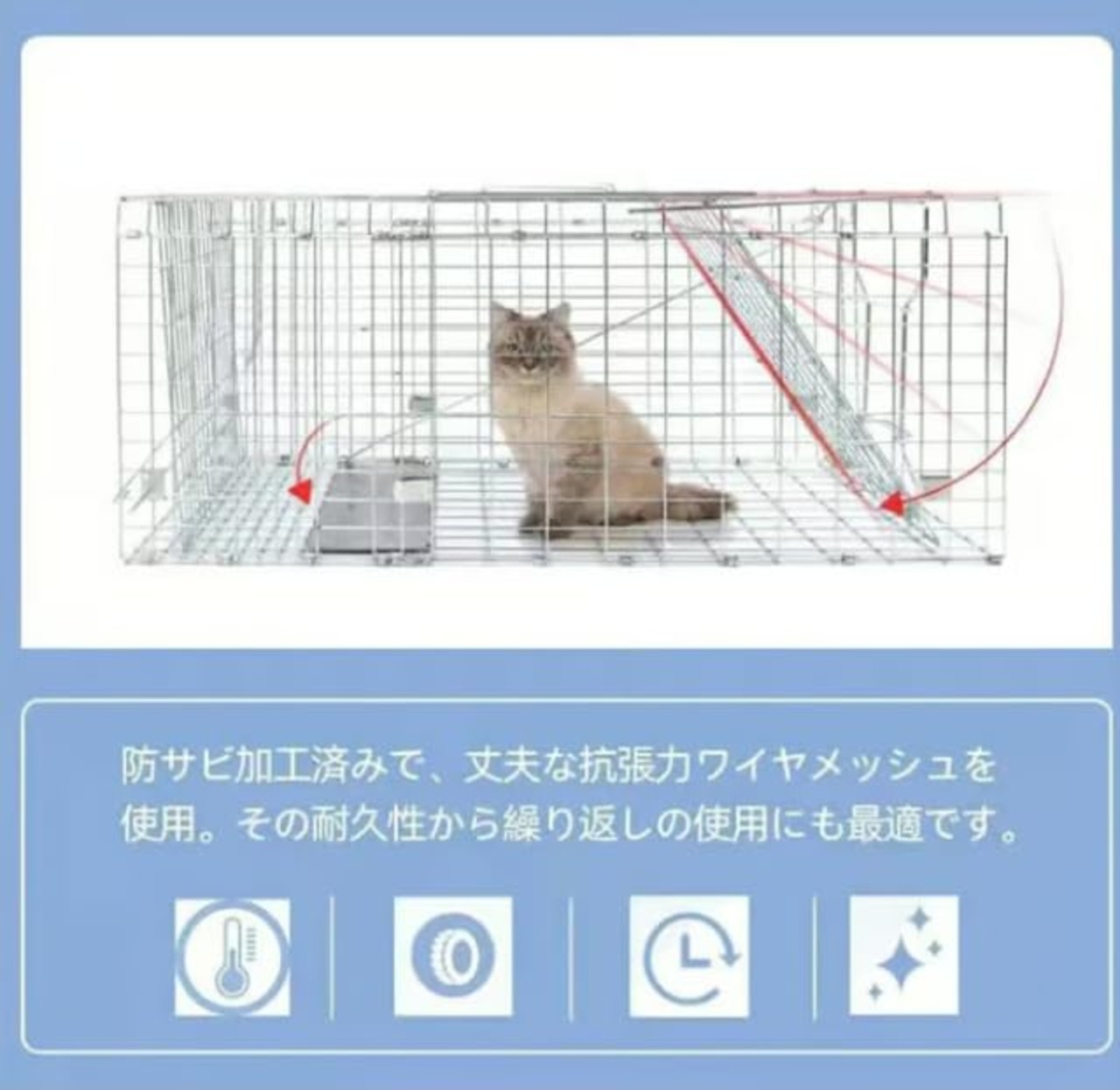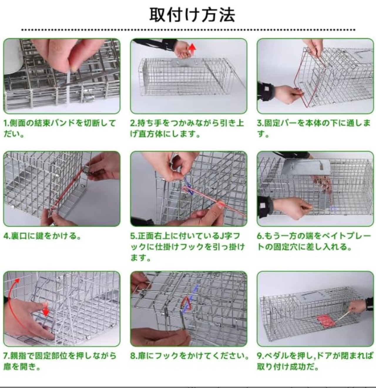 【シンプルな仕掛けで設置も簡単】女性でも簡単に組み立てができ、踏み台を動物が踏めば素早く扉が閉まり効率的に動物の捕獲が行えます。 動物愛護法や鳥獣の保護及び管理並びに狩猟の適正化に関する法律 (鳥獣保護の狩猟に関する法律)に準じてお使い下さい。