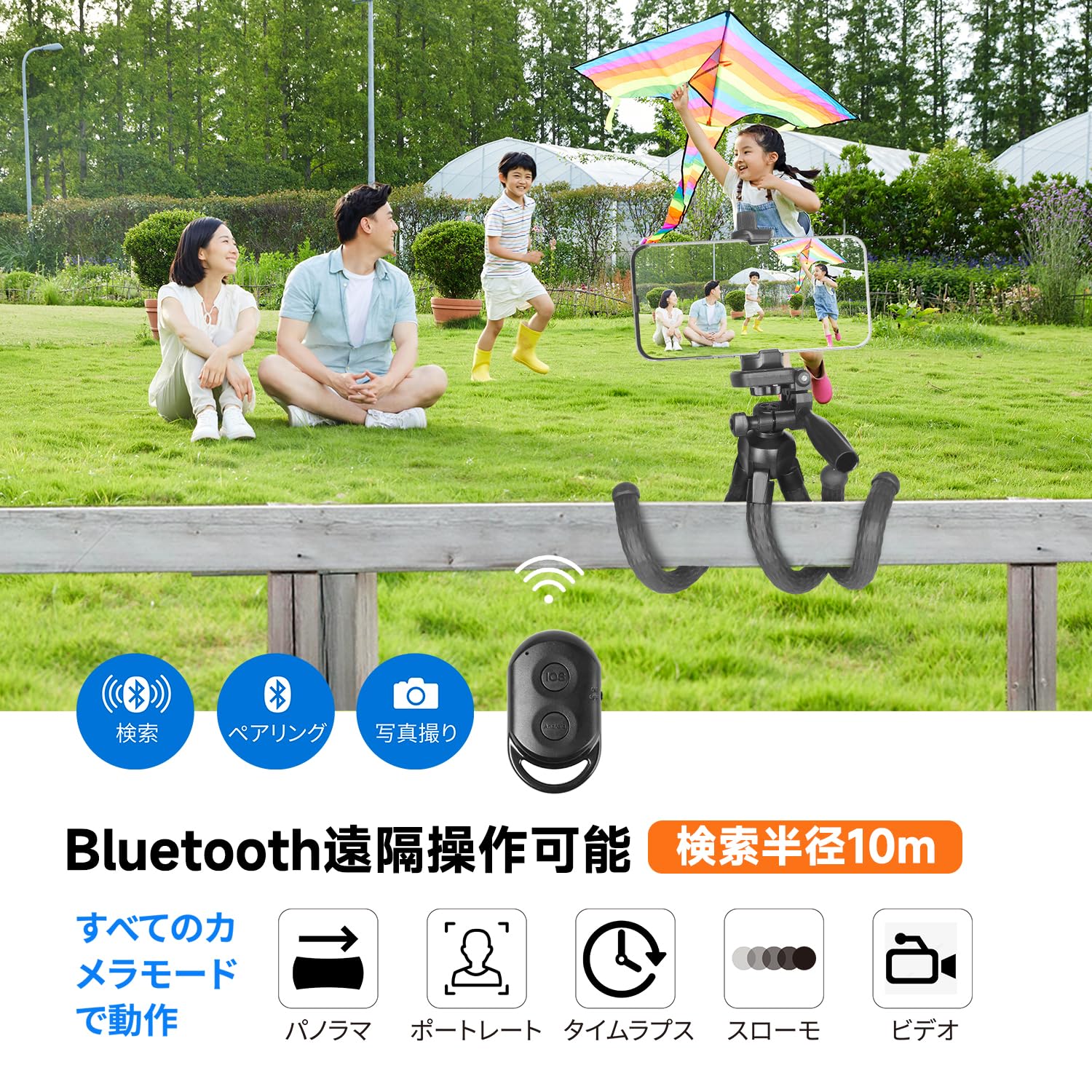 【幅広く対応】くねくねスマホ三脚は1/4ネジが付き、1kgまでのカメラ、スマホに対応します。タブレットホルダーとしても使えます。また、スマホ用リモコンが付くことで、スマホを約10m遠距離コントロールできます。リモコンは技術基準適合証明認証済で、ご安心に使用ください。【ご注意】 最初Bluetoothにペアリングし、リモコンボタンを押したら、シャッター機能ではなく音量が上がるやズーム機能になる場合、カメラ画面の設定から音量ボタンやズームボタンをシャッターに変更すれば正常なシャッター機能になります。
