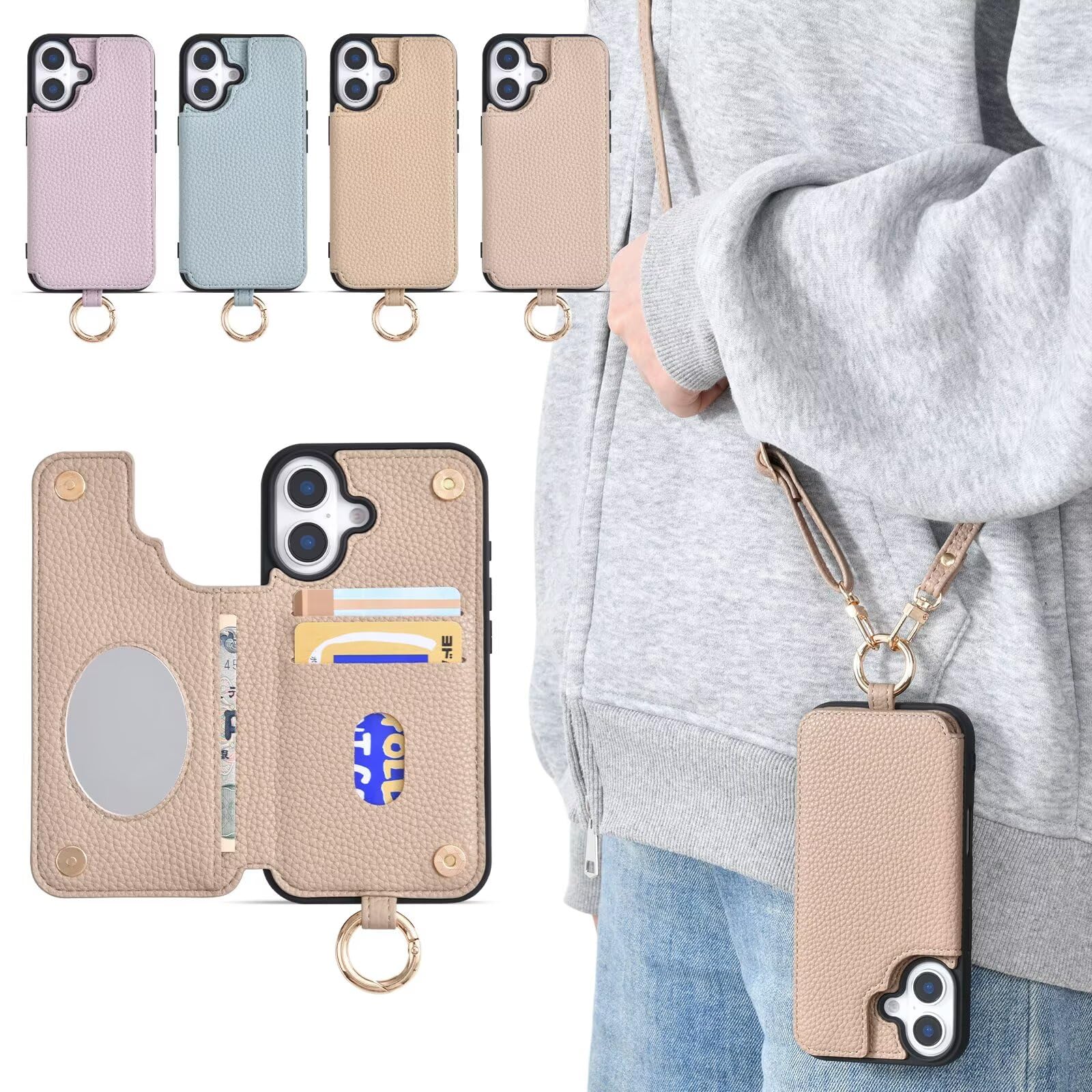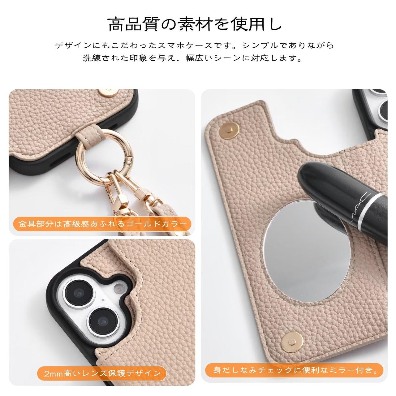 iPhone 16Pro スマホ ケース ショルダー おしゃれ スマホケース iPhone 16プロ ショルダー 斜めがけ 肩掛け 首掛け アイフォン 16プロ ケース 収納 ミラー付き 首かけ 女性 ストラップ 財布型 カバー スマホリング スタンド アイフォン 16PRO 携帯電話ケース レディース スマホケース ショルダー付きケース 調節可能なストラップ(アプリコットピンク)