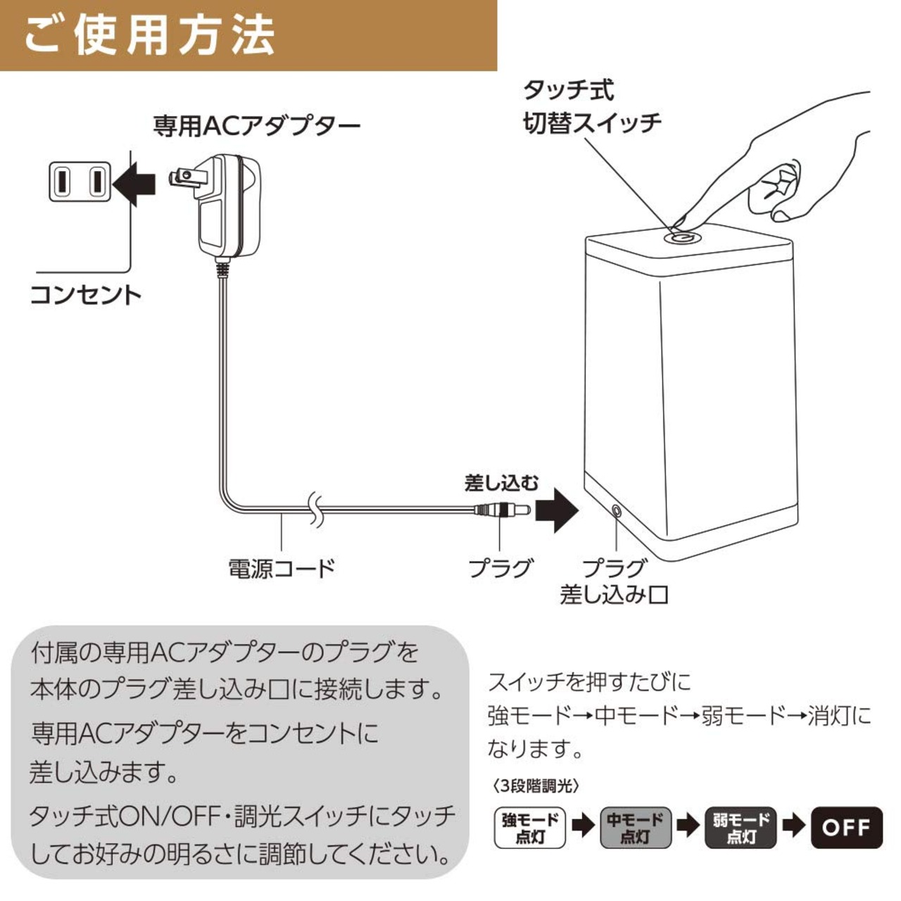 強/中/弱モードの3段階調光式で、常夜灯としても使用できます● 軽くタッチするだけで明るさが調節できる、タッチ式調光スイッチ● 丈夫で汚れにくい、ポリカーボネート製セード