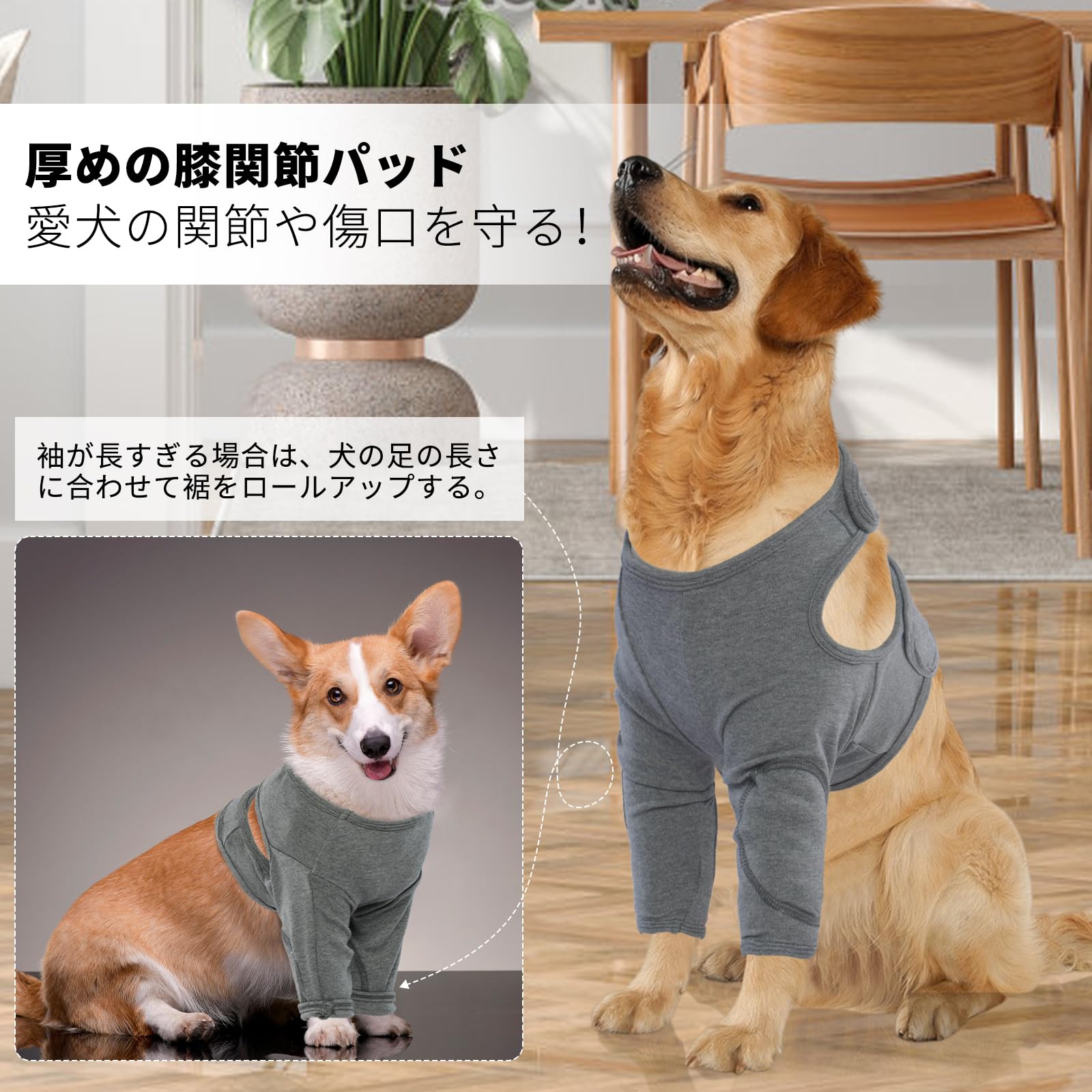厚くなった関節パッド:リカバリーカバーの厚くなったパッドは、愛犬が床に横たわっている時の摩耗や損傷から愛犬の関節を保護します。 また、保護服は、愛犬が怪我を悪化させないために必要なサポートを提供し、同時に最適な快適性と保護性を提供します