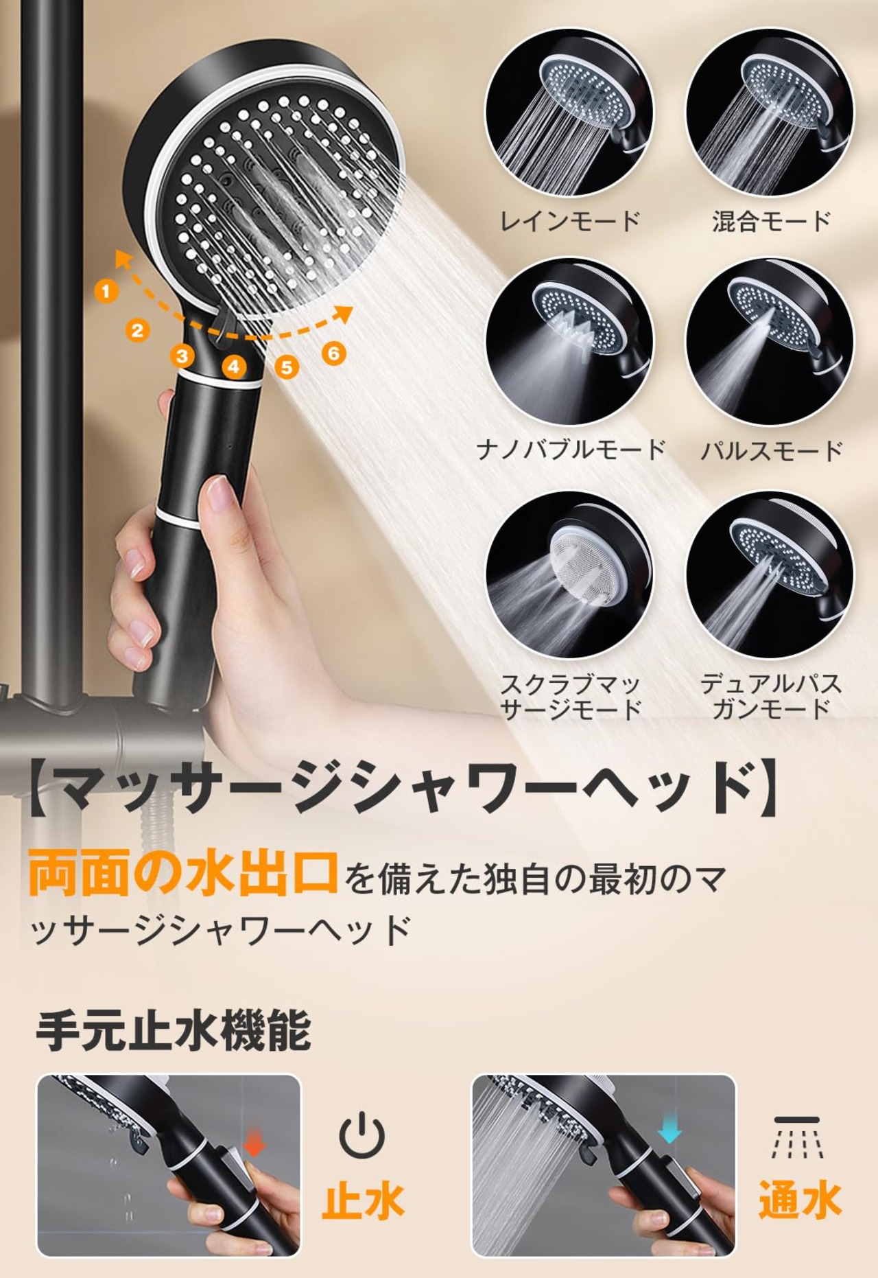 【2024新登場マッサージシャワーヘッド・高洗浄力】両面の水出口を備えた独自の最初のマッサージシャワーヘッド。水を最大5億個の超微細な泡に変え、ナノバブルが毛穴の奥まで入り込み、洗浄力と保湿力を高めることで、体の筋肉と肌を完全にリラックスさせるシャワーです。 柔らかなシリコンのマッサージ粒子が、泡を洗い流しながらマッサージ。肌の水分量が20%以上アップ,より快適でリラックスできるシャワー体験を提供します。