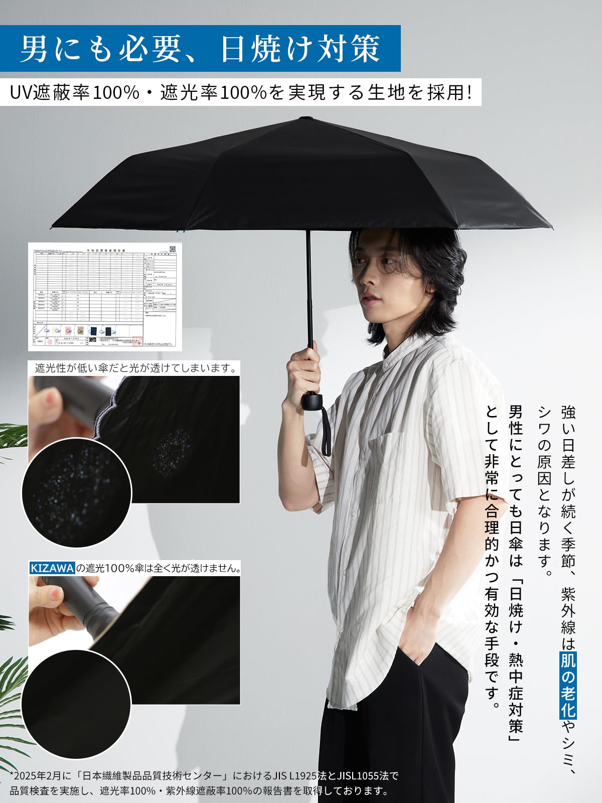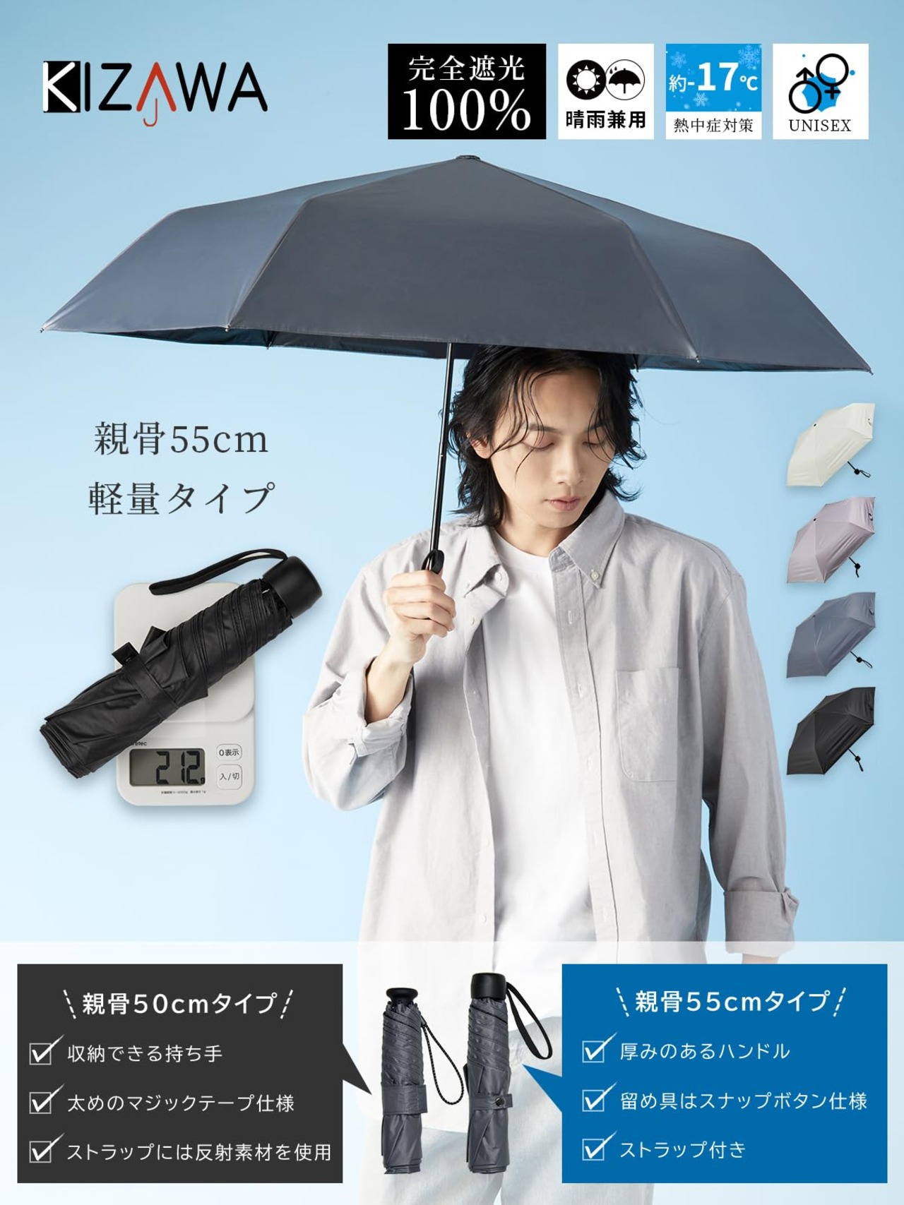 KIZAWA 日傘 メンズ 晴雨兼用 軽量 コンパクト 親骨55cm 50cm カラビナ付き 男性向けデザイン 折りたたみ傘 uvカット 100 遮光 折り畳み傘 完全遮光 5級撥水 レディース 遮熱 おりたたみ傘 大きいサイズ 丈夫 小型 暑さ対策 風に強い