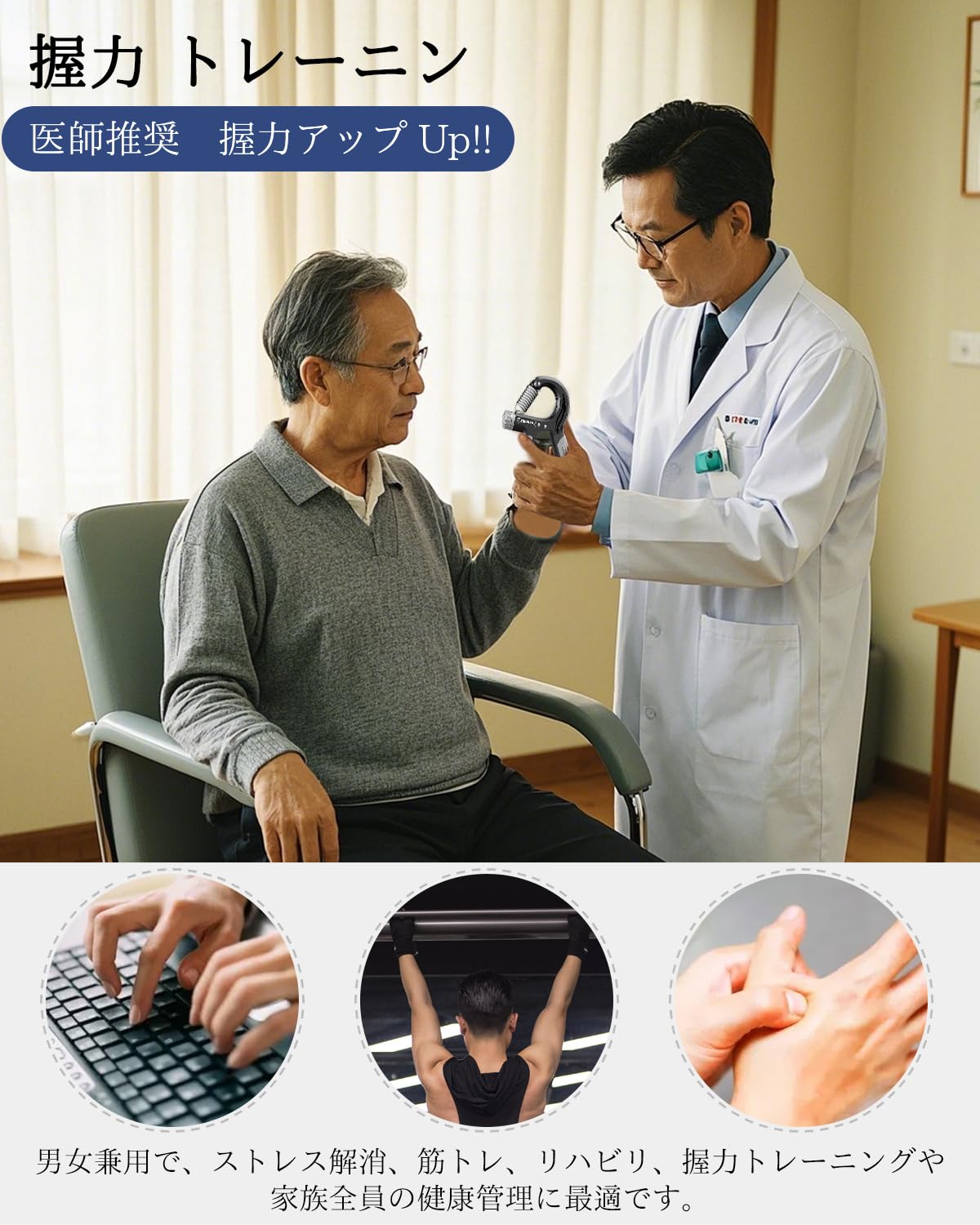 【医療現場でも推奨される超耐久ハンドグリップ】 当社のハンドグリップは、医師推奨の信頼性と、静音高級鋼バネによる耐久性を両立。このハンドグリップは3.0mmの厚みがある高級鋼バネを採用しており、繰り返し握力 トレーニング使用にも耐える頑丈な作りです。静音バネ採用で騒音レベル35dB以下(図書館並みの静かさ)握力グリップ。握力 トレーニング動作時の騒音を抑えた静音設計のハンドグリップで、周囲を気にせず筋トレや握力 トレーニング可能。ハンドグリッパーとしての性能と耐久性を兼ね備えた逸品です。このハンドグリップは、単なる握力グリップではなく、厳しい要求をクリアした本格派ツールです。ハンドグリップ 可変式のデザインで、静かで安全、そして何より長持ちする握力 トレーニング器具をお探しの方に最適です。ハンドグリップとしての基本性能に加え、握力 トレーニング道具としての耐久性を極限まで追求。当社のハンドグリップは繰り返し握力 トレーニングにも耐える頑丈な作りで、自宅やジムで長く愛用できます。男女兼用ハンドグリップで、筋トレ、握力強化や家族全員の健康管理に最適です。プレゼントにも最適な高品質仕様です。