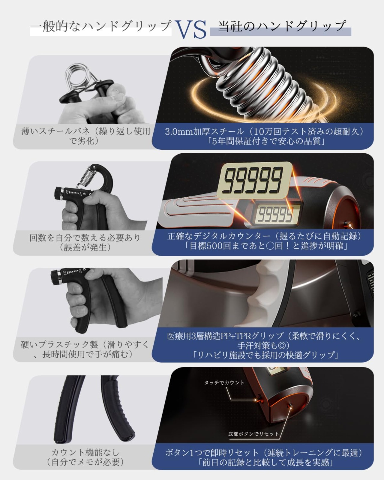【99999回自動計測ハンドグリップ!日本初の「見える化」カウンターで目標達成率200%↑】 このハンドグリップの握力グリップにはカウンター機能を搭載し、握力 トレーニング回数を自動記録。ハンドグリッパータッチでカウント、グリッパーの底部ボタンでリセットし、握力 トレーニングや筋トレの進捗管理が簡単にでき、目標設定にも最適ハンドグリップ。握力回数を0~99999回記録できるため、握力 トレーニングのカウントを実現しながら、耐久性にも優れています。このハンドグリップは、筋トレの効果を「見える化」する握力グリップです。筋トレ開始前と終了後の握力を数値で比較できるので、効果が実感しやすくなり、ハンドグリッパーとしての基本機能に加え、握力を鍛える道具としてデータ管理も可能。1日ごとの進捗を確認でき、モチベーション維持に役立ちます。握力強化や筋トレの効果を数値で握力計として確認可能。スポーツ前後の握力チェックにも便利です。 このハンドグリップは単なる筋トレグッズではなく、あなたのトレーニングをサポートするパートナーです。便利ながら高性能な握力グリップで、効率的な握力 トレーニングを始めましょう!