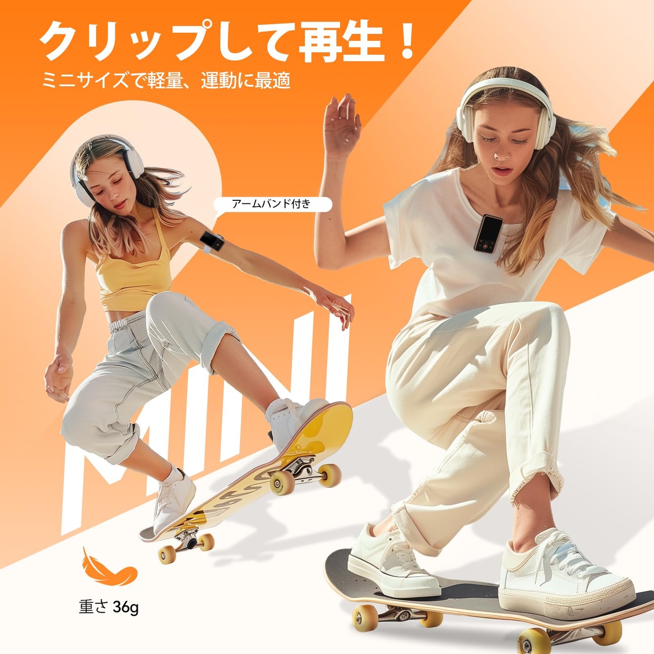 【クリップデザインで運動をもっと楽しく】ポータブルなクリップデザインで、mp3プレーヤーをスポーツウェアやアームバンドに簡単に固定できます。小さくて軽いミニボディは、運動中に邪魔になりません。音楽と一緒にスポーツを楽しみましょう。はわずか36gの重さで存在することに気付くことさえありません。本体のサイズは7.5*4*1cmです(クリップを含め厚さは約1.8cmです)。