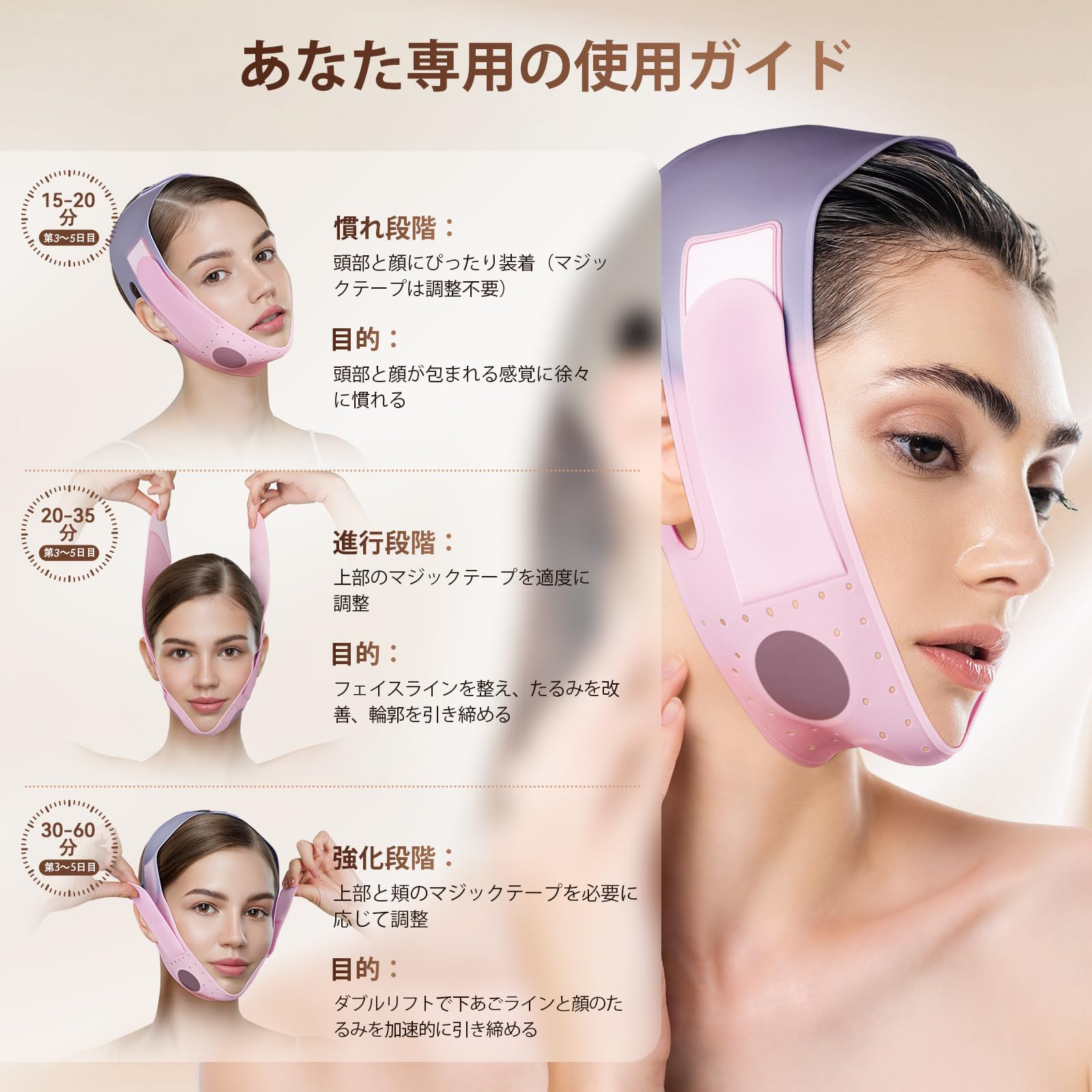 【✨Vライン引き締めで小顔革命✨】 たるんだフェイスラインや二重あごをググッと持ち上げ、顔全体をすっきりシャープに整える小顔ベルト。毎日わずか数分のケアで、自宅でサロン級のたるみ リフトアップ効果を実感できます。大切なイベントや撮影前にも活躍し、「小顔矯正・美顔・リフトアップ」を同時に叶えます。"