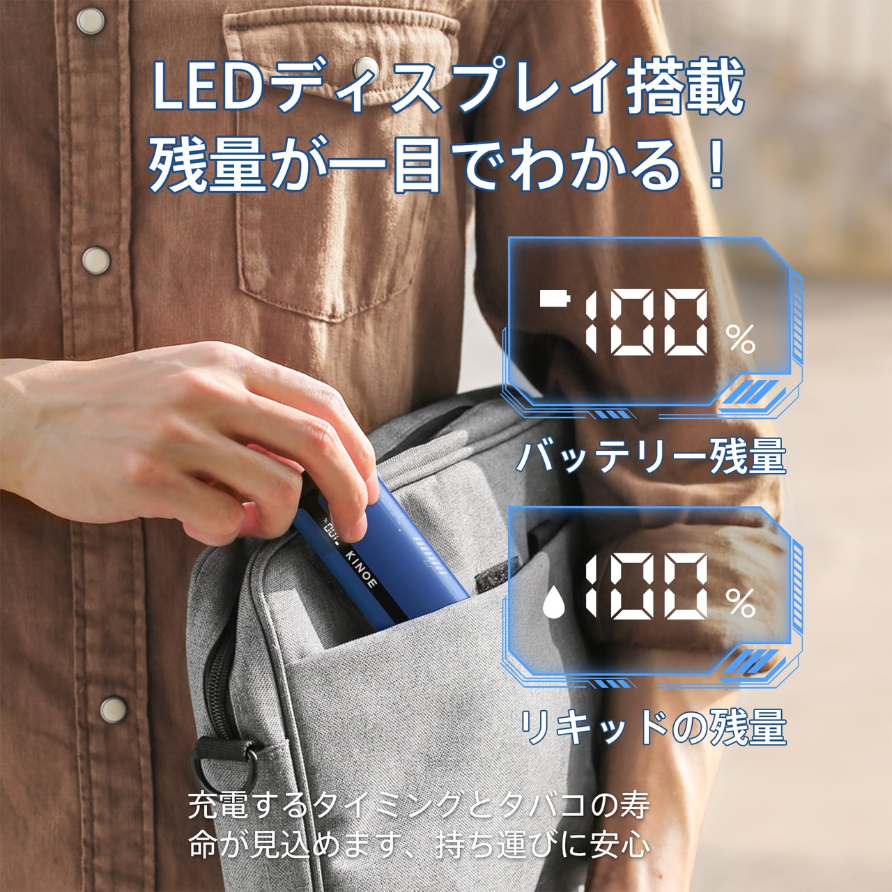 【持ち運びシーシャの爆煙タイプ】KINOE最新発売機種、バッテリー残量、リキッドの残量がひと目で分かるLEDディスプレイを搭載した電子たばこ。オリジナルコイル内蔵して、濃厚なフレーバーと爆煙が楽しめるクオリティの高いシーシャ。