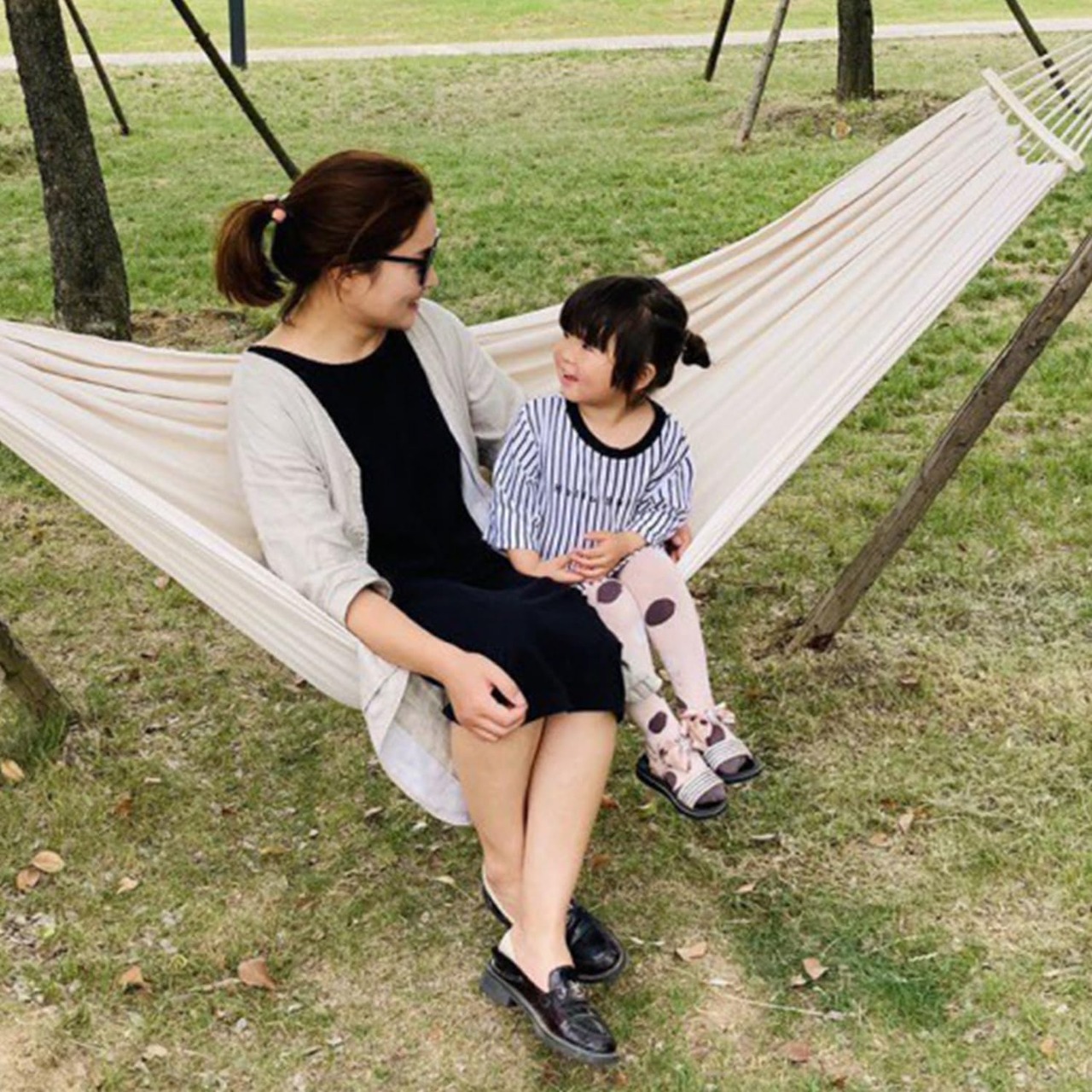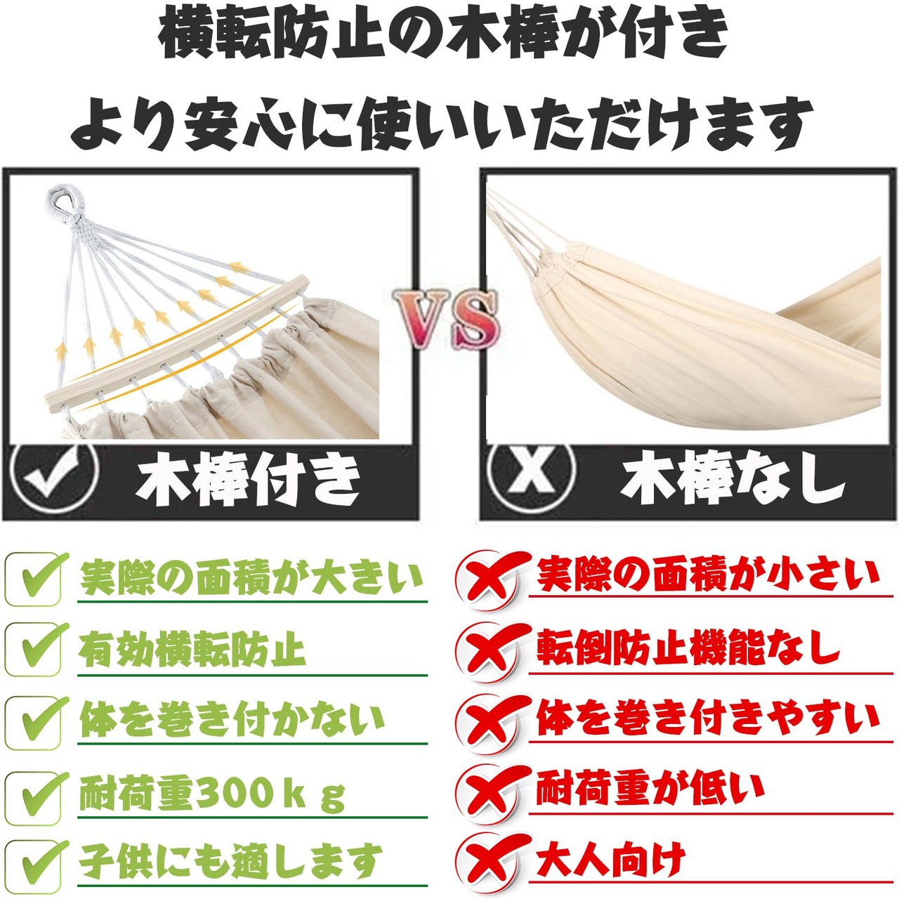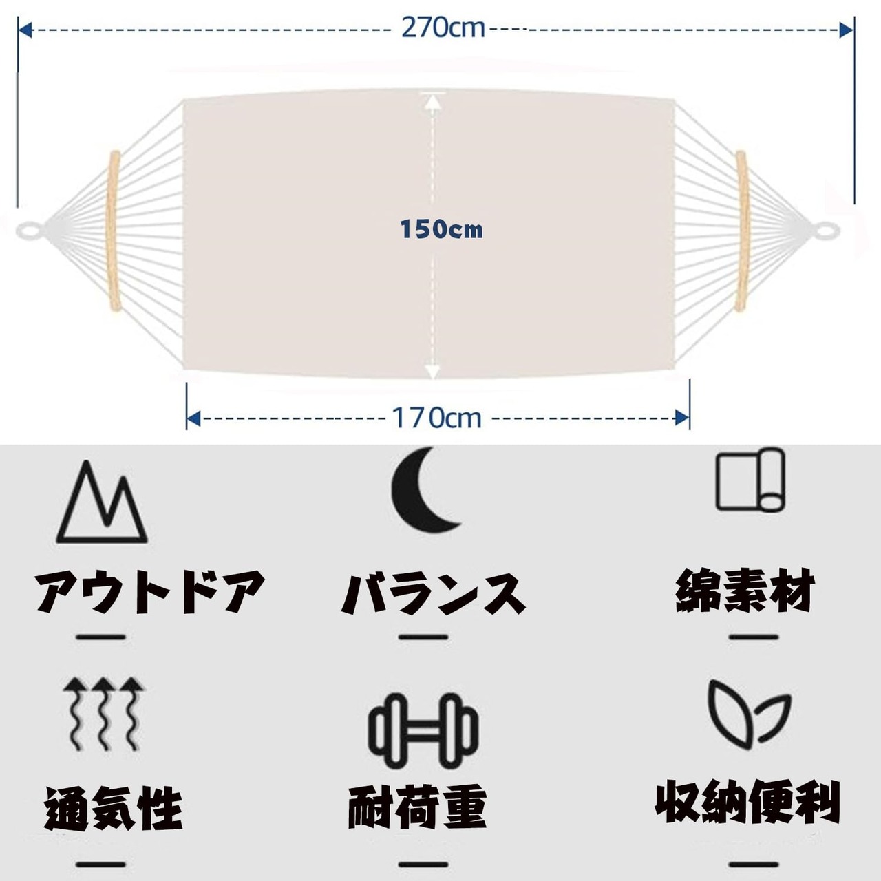 【ここがポイント】綿麻混の素材を採用し、十分な厚さと通気性があり、丈夫で破れにくい、300kgまでの耐重荷全く問題なし。両端に木棒が付いている仕様、ハンモックが絡まりにくく、扱いやすくなります。人が乗った際に重量を分散し、転倒をしっかりと防止できます。