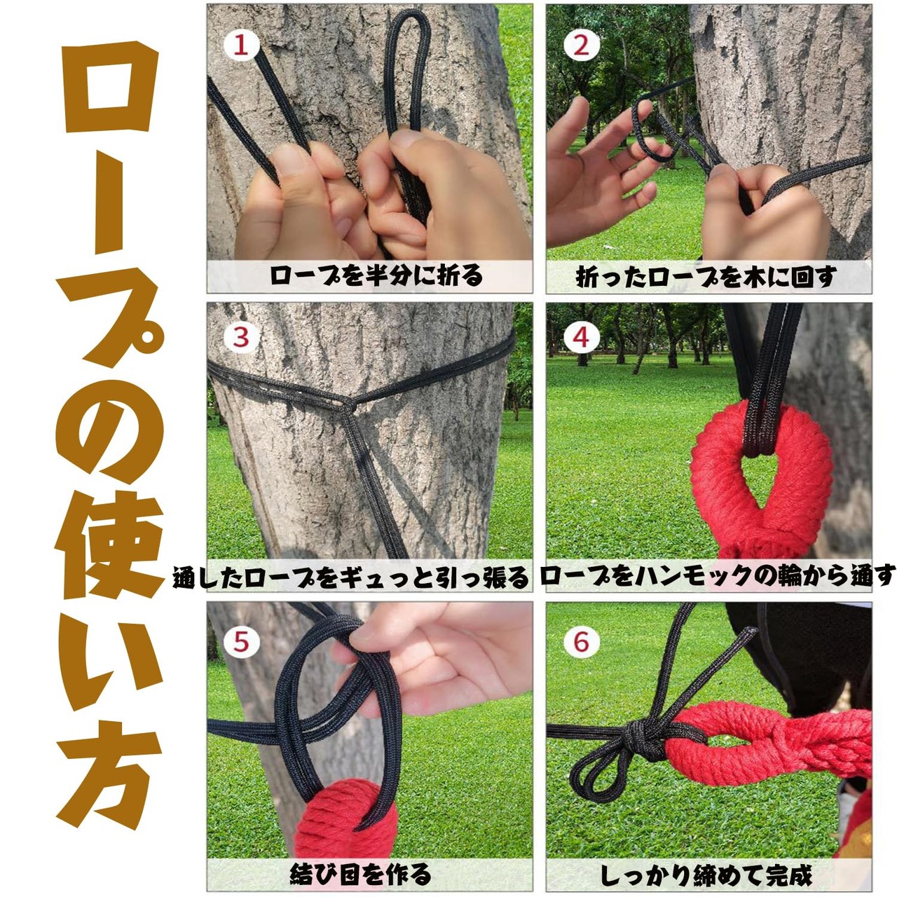 【設置簡単】ハンモックはカラビナが付き、ロープでハンモックを2本の木に吊るしたりすることたけで完成。ハンモックを設置するのに数分しかかかりません。