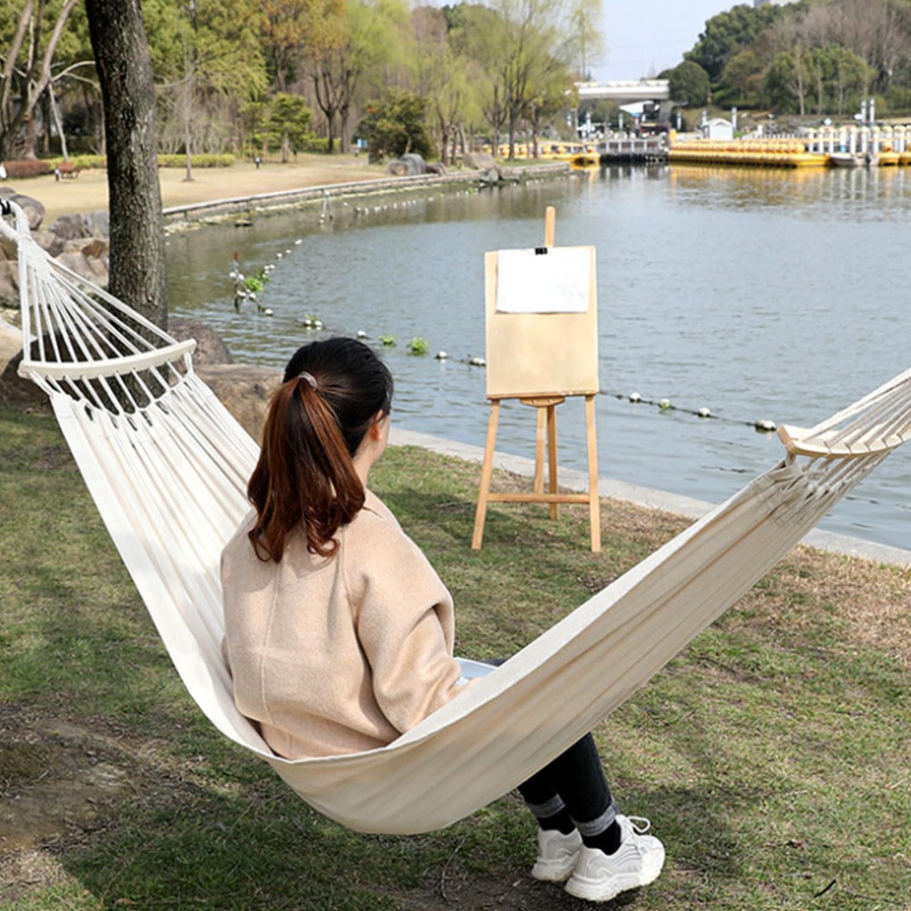【特価セール】ハンモック2人用 転倒防止 超広い 収納袋付き キャンプ ピクニック アウトドア ダブル ハンモック 肌触り良い コンパクト 公園 吊り下げ式 (オフホワイト)
