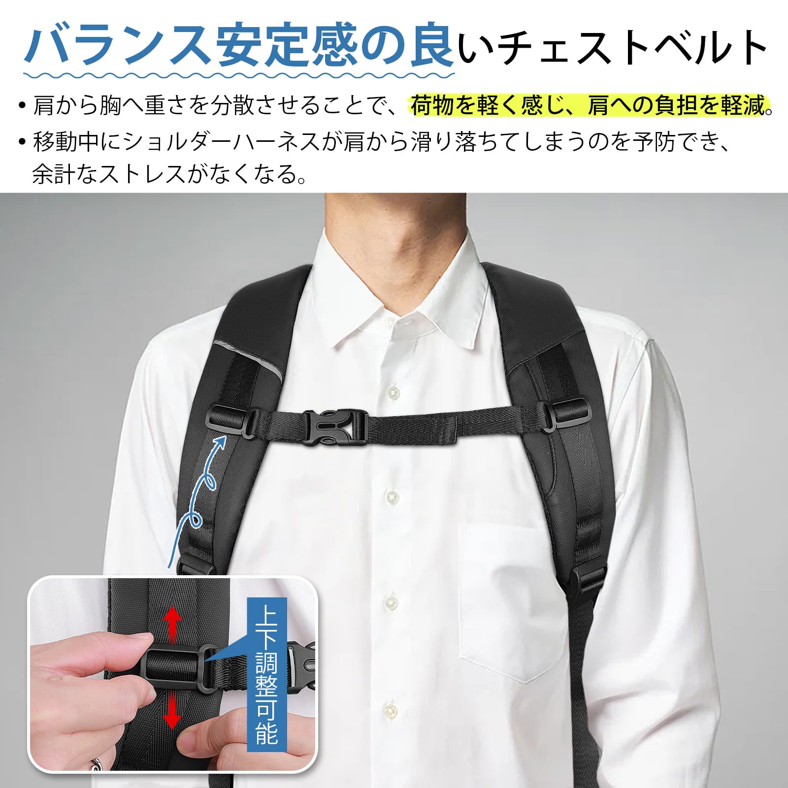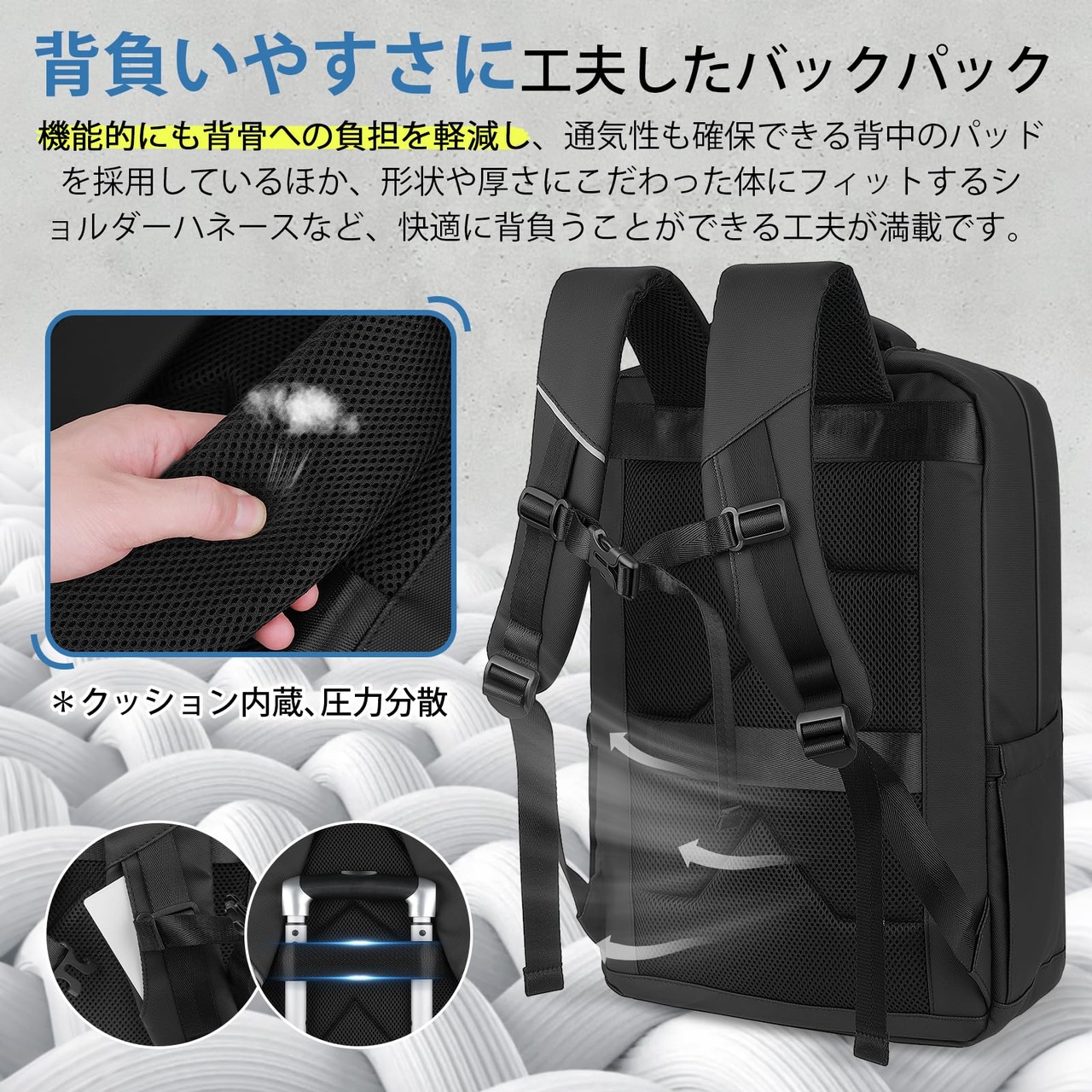 【撥水&自立設計】本ビジネスリュックは、表面に特殊な撥水加工を施した高密度素材と、メイン開口部の防水ファスナーを採用。小雨や飛沫をしっかりシャットアウトし(※完全防水ではありません)、汚れも濡れ布でサッと拭き取れるため、清潔な見た目を常にキープ。さらに、素材そのものの張りと強度により、中身が空の状態でも自然な立体感を保ち、決してベタッと崩れ落ちません。オフィスのデスク脇やカフェのテーブルに置いてもきれいなフォルムを維持し、スタイリッシュでプロフェッショナルな印象を演出。ビジネスバッグに求められる実用性と洗練された佇まいを両立しています。