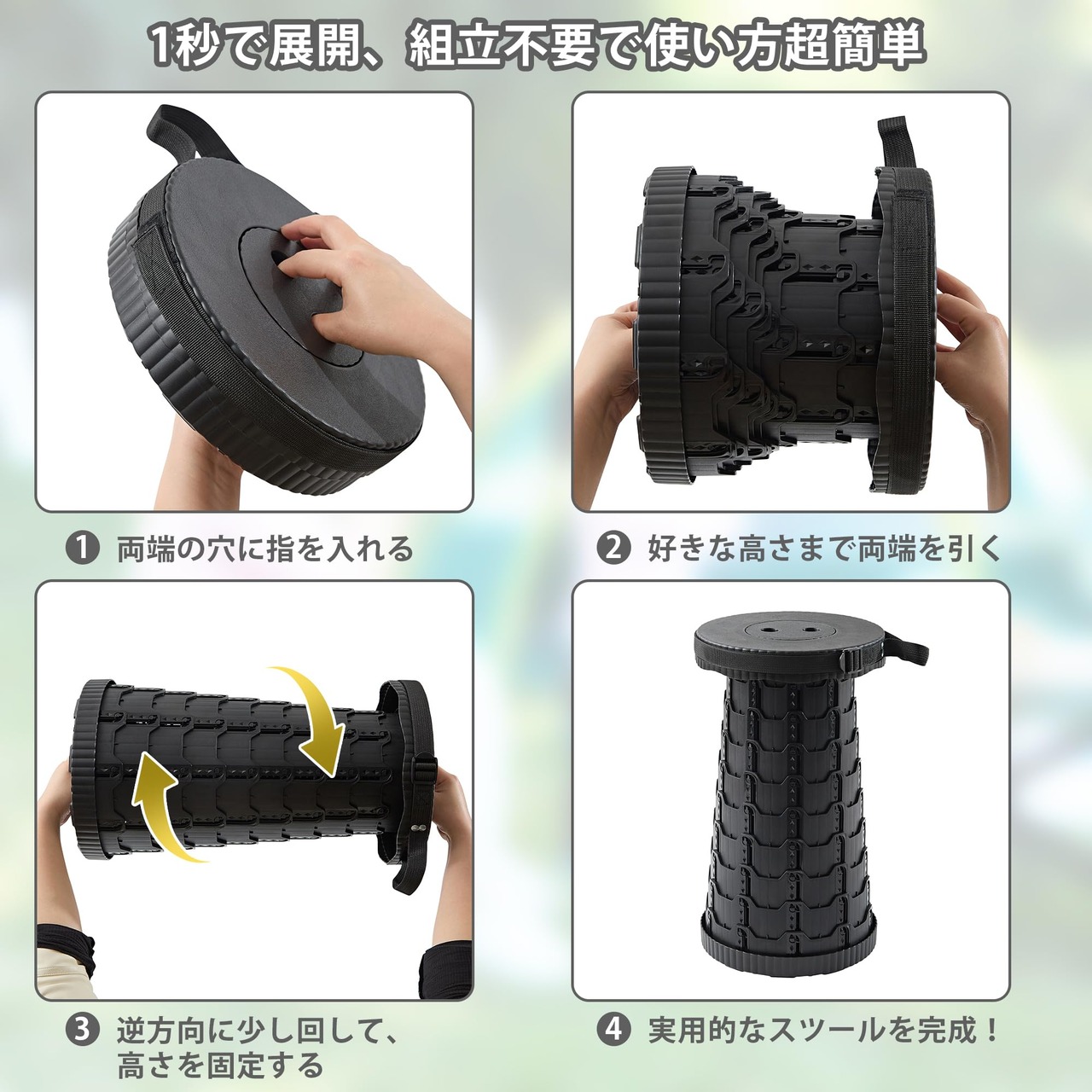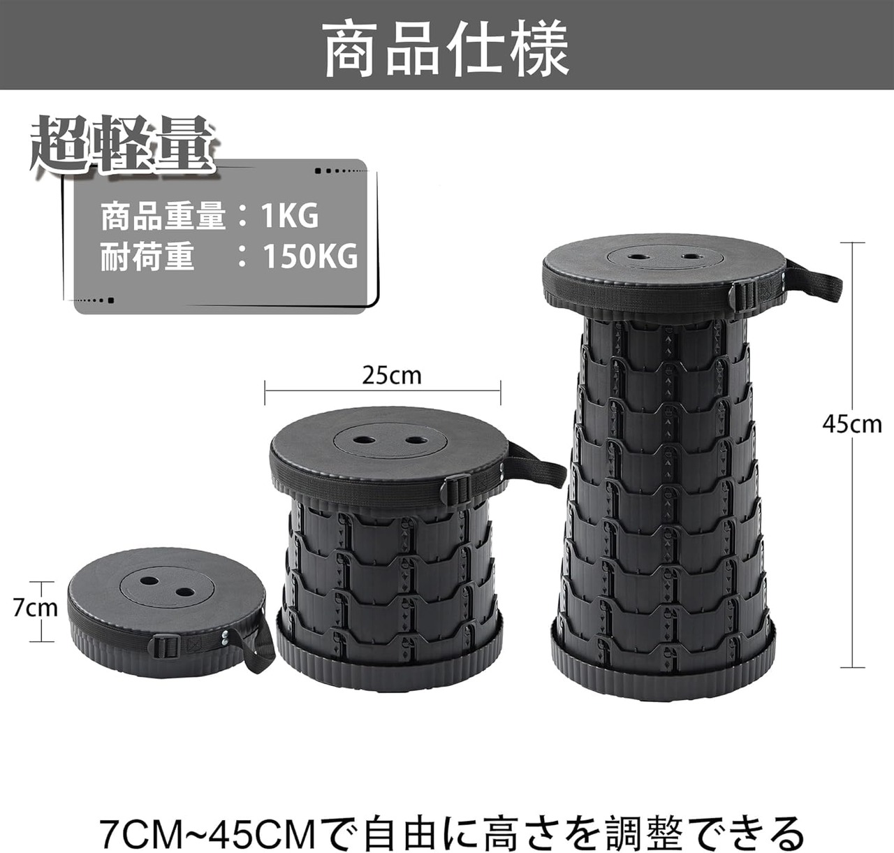 【商品詳細情報】この折りたたみ椅子について:展開サイズ:直径25×高さ7~45cm、高さが自由に調節可能です; 耐荷重:150kg; 梱包サイズ:幅26×奥行26×高さ7cm; 製品重量:(約)1.1kg; 材質:高品質プラスチック; 色:ブラック