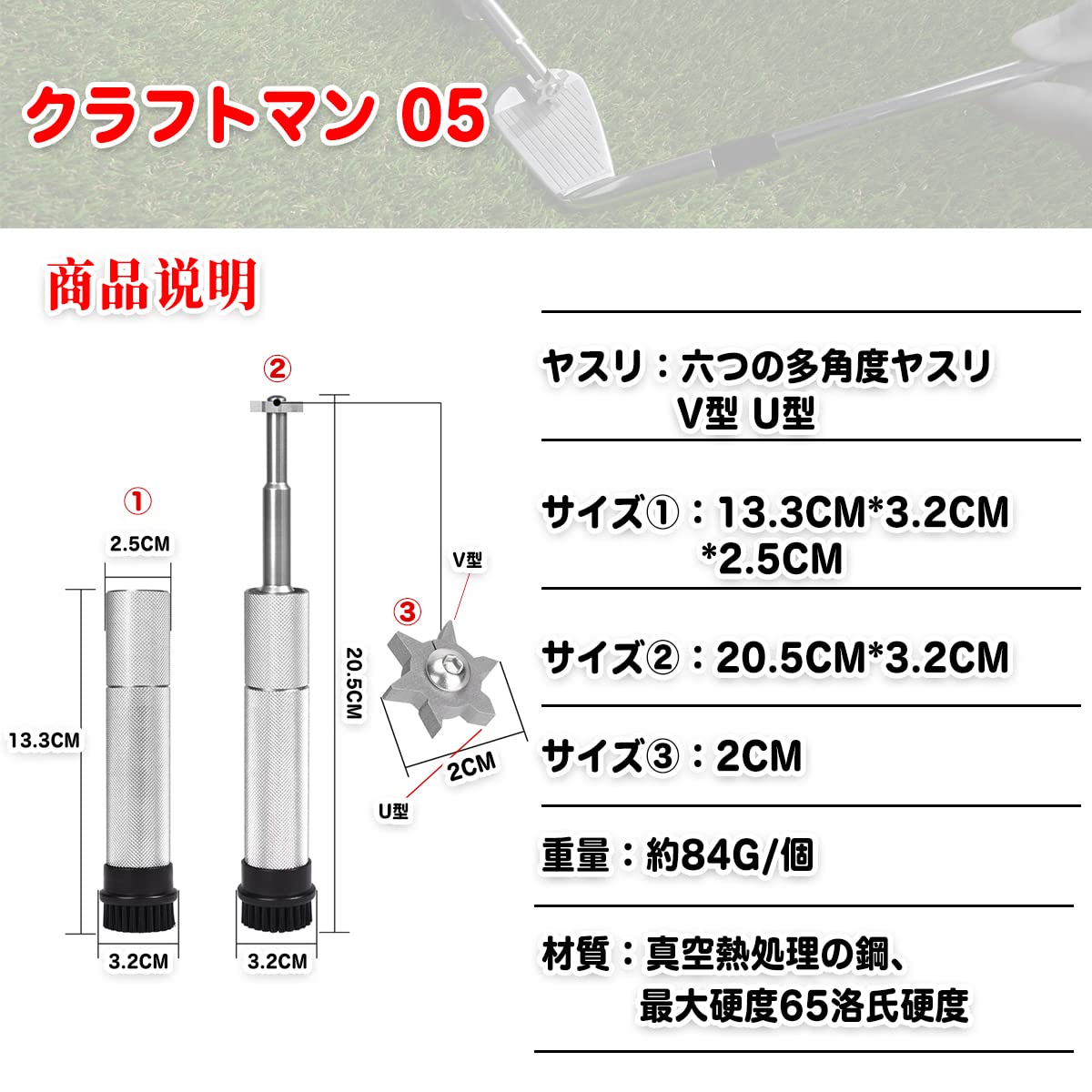 【ヤスリ】六つのヤスリが持ちています。それぞれの角度が違いため、アイアン、ウェッジなどを多角度で清潔できます。アイアンの溝に砂が詰まって固まりなどな問題を簡単に解決でき、スピンを維持します。