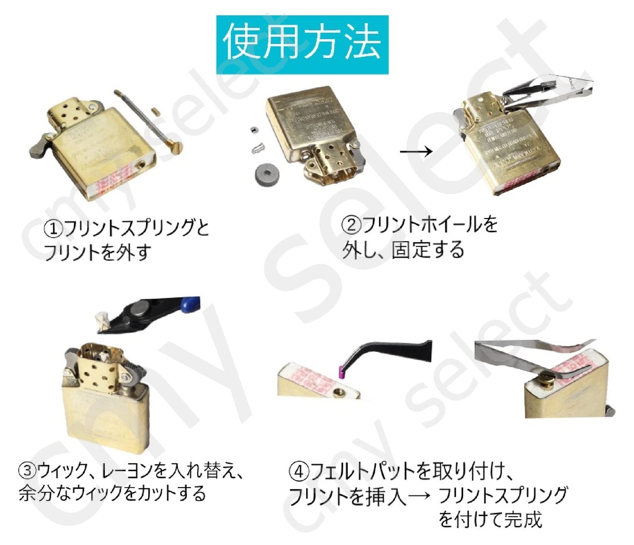 【2022最新】[cmy select] オイルライター メンテナンス キット 5点セット フェルト ウィック レーヨン フリントホイール フリントスプリング 汎用 ライター 部品 替え芯 交換用 ライターオイルセット 20230309-zippo-maintenance-set-a