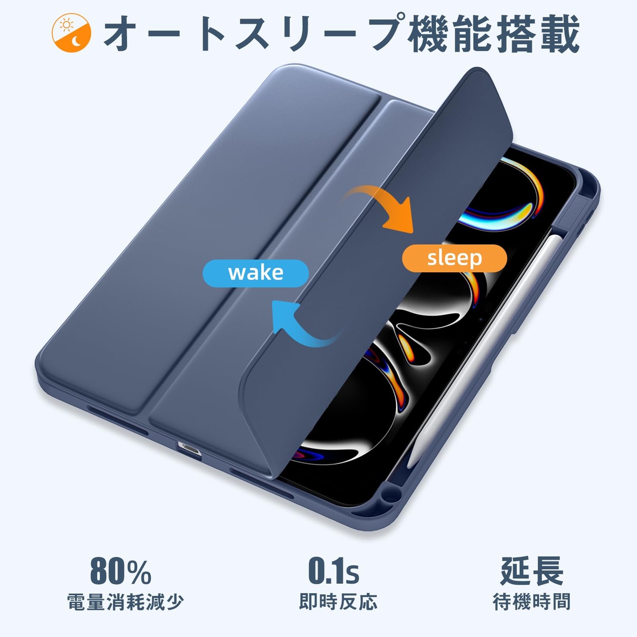 【自動ウェイクアップ/スリープ機能】 対応iPad pro m4 11インチ ケースはオートスリープ機能が搭載されています。ケースのフタを開けると対応iPadが起動し、フタを閉じると自動的にスリープモードになります。マグネット内蔵されているためカバンに入れてもカバーが勝手に開けることを心配必要なくしっかり閉められます。自分で対応iPadをON/OFFする手間を省くことができます。