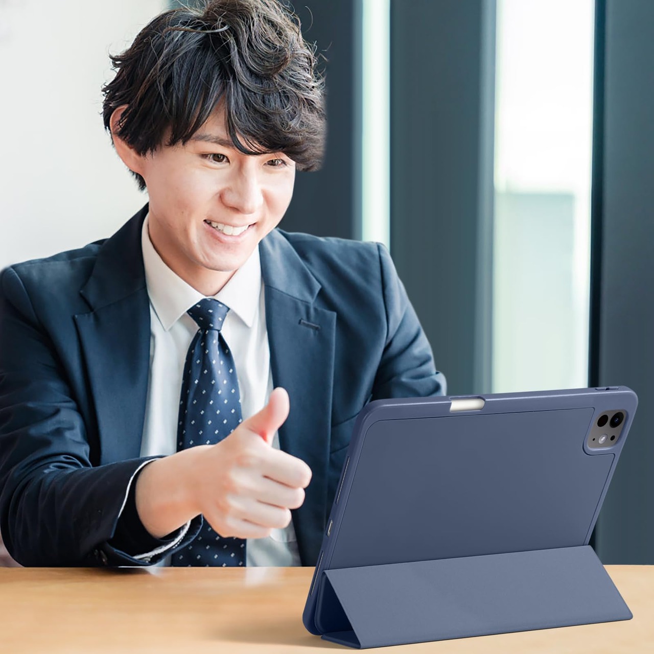 【全面保護・放熱デザイン】 ケースの前蓋は柔軟で耐衝撃性高い合成PU素材を採用され、端末にしっかりフィットして対応iPad Proを保護するだけでなく、滑らかな手触りを提供する。背面TPU素材なので、軽量、超薄を備えて取り出しも簡単、本体をキズ付かない。同時にケース内部は端末の放熱のためのエアーを逃す溝の空間を作るで本体に熱がこもるのを防ぐよう設計をする