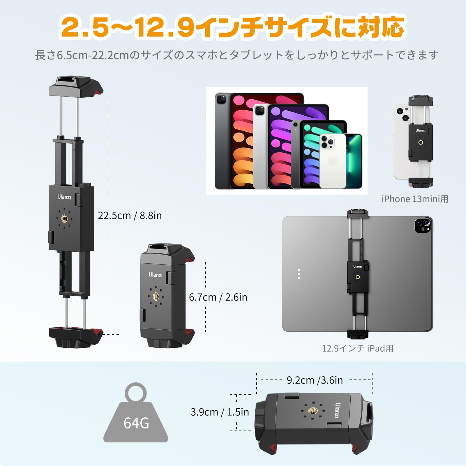 【ユニバーサル】両方向に調節可能な2イン1のスマホホルダー/タブレット三脚マウントアダプターの調整幅は65mm-222mmです。ホルダーは2.5~12.9インチの範囲内での使用に適用です。iPhone、iPad Mini、iPad、iPad Air、iPad Pro、Surface Go、ほとんどの携帯電話やタブレット端末の縦置き、横置きにサポートします。* 12.9インチ以上のタブレットを横方向でのみサポートします。
