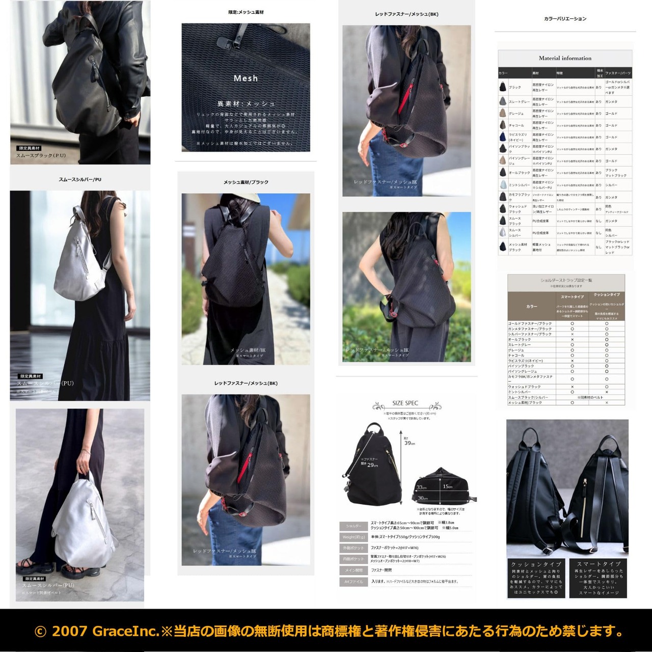 【サイズ(約:cm)】素材:ナイロン/再生レザー/合成皮革/ポリエステル※カラーにより素材が異なります。あらかじめご了承下さい 高さ:39×幅:33~30×マチ:15 生産国:中国製 ショルダー:長さ: スマートタイプ長さ:65cm~90cmで調節可。幅3.7cm/ショルダークッションタイプ長さ:50cm~100cmで調節可。幅5.0cm Weight (約: g):本体:スマートタイプ550g/クッションタイプ500g 外側ポケット:ファスナーポケット×2 内側ポケット:メッシュポケット×2 背面ファスナー取り出し仕切りオープンポケット×1 メイン開閉:ファスナー開閉 A4ファイル:入りました ※若干の個体差はご容赦ください (約:cm) ※スタッフが実寸で計測しています ※モニターの都合上、掲載写真と実際の色が異なる場合がございます。