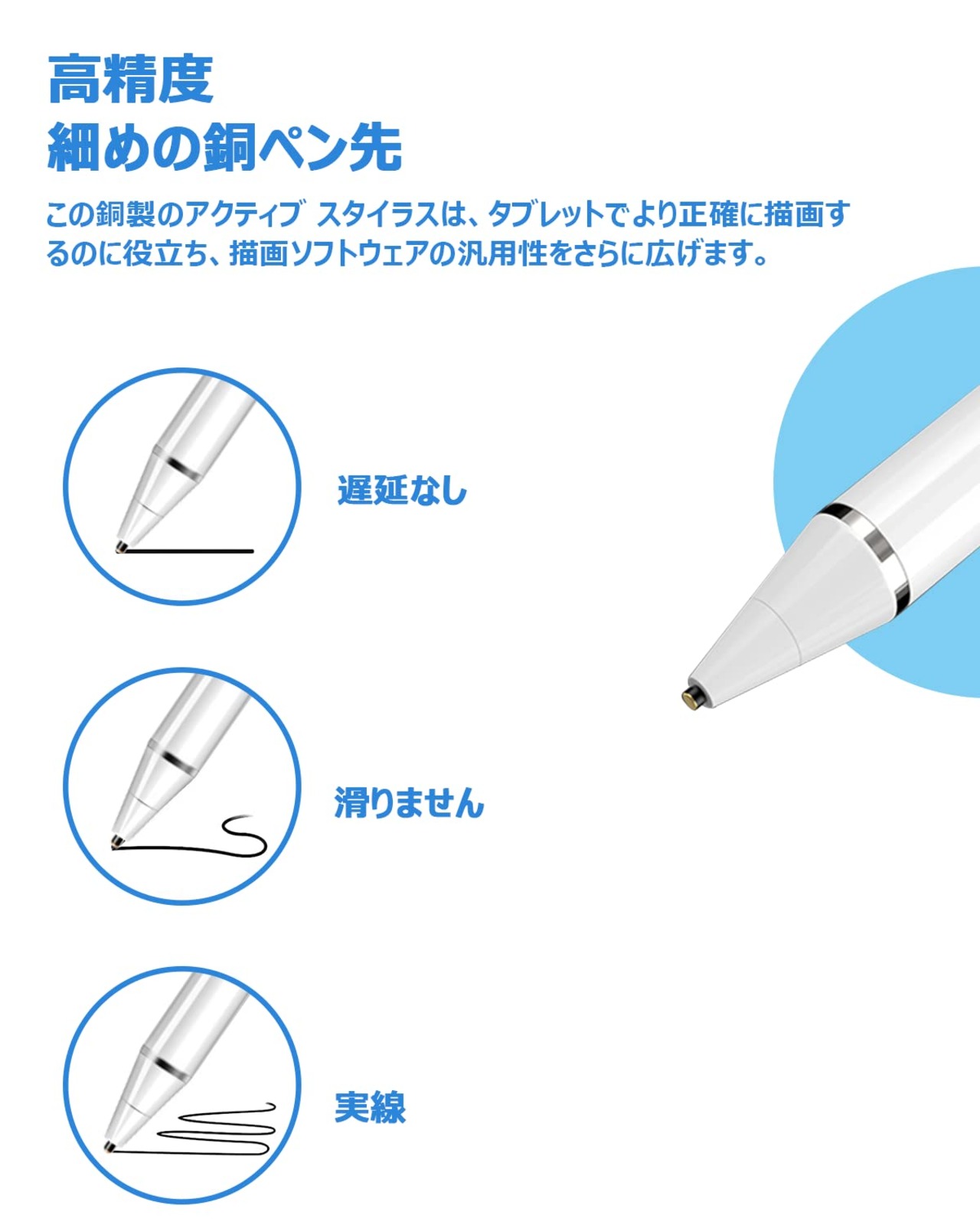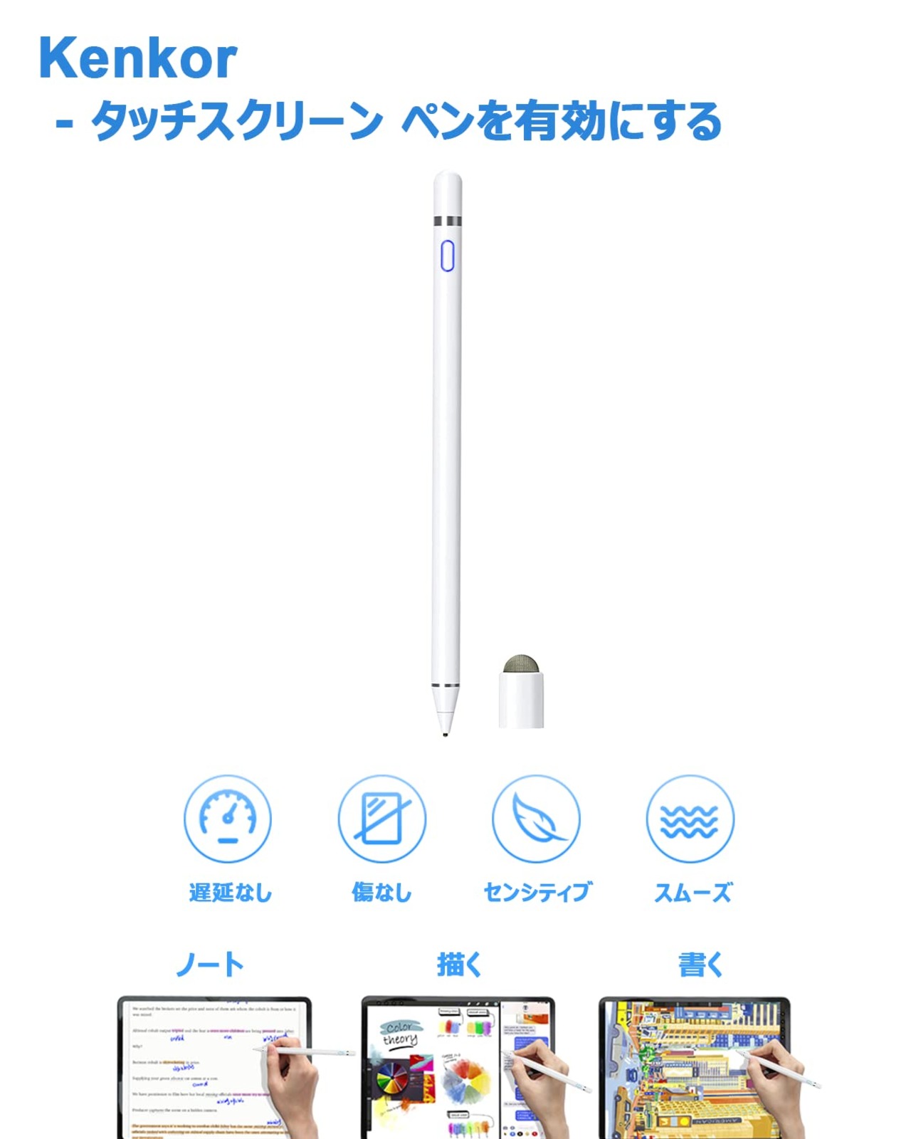 【2022最新】タッチペン Kenkor スタイラスペン タブレット用すたいらすぺん 1.45mm 極細ペン先 iPad ペン スマホ たっちぺん iPad/タブレット/iPhone/Samsung/Lenovo/Android/iOS に対応 2 つのキャップ付き (白)