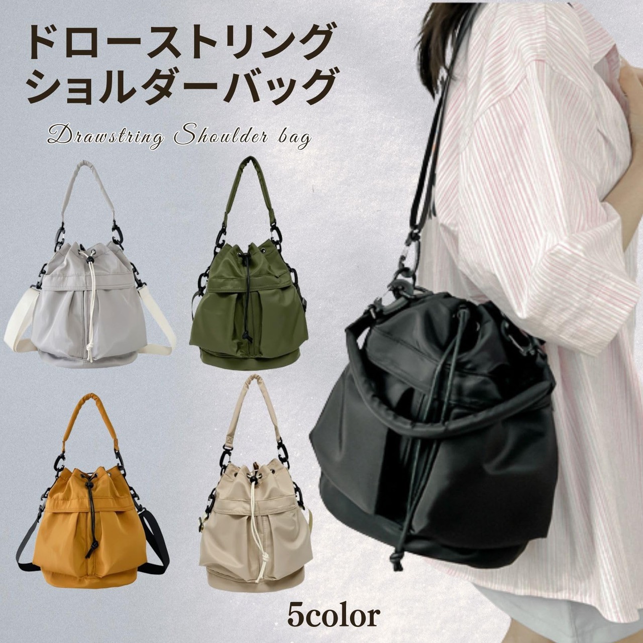 【シンプルで使いやすい】ギュッと絞ったフォルムが特徴的な巾着型ドローストリングバッグ。シンプルなデザインのため、カジュアルにもきれいめにも似合い、男性にもご利用いただけるユニセックスなアイテムです。取り外し可能なハンドルとショルダーストラップが付いており、ハンドバッグ、ショルダーバッグとして使える2way仕様。アウトドア、スポーツ観戦、お子様とのお出かけ等、両手を空けたい時にも便利なアイテムです。