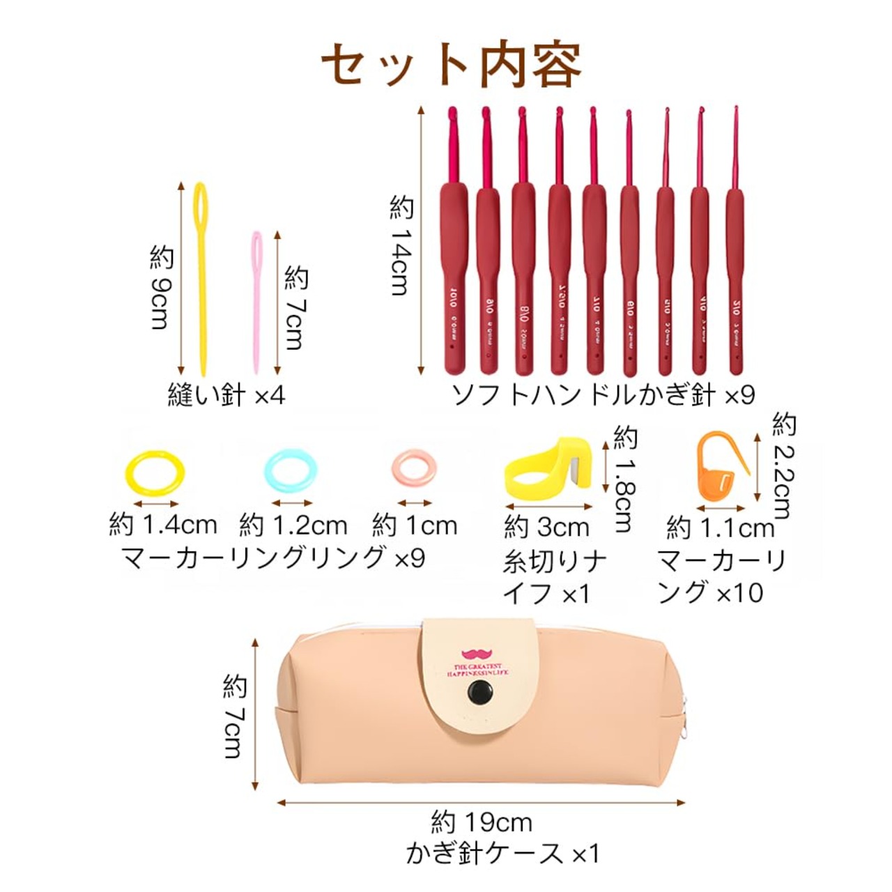 セット内容:かぎ針×9、縫い針×4、マーカーリング×10、マーカーリングリング×9、糸切りナイフ×1、かぎ針ケース×1。