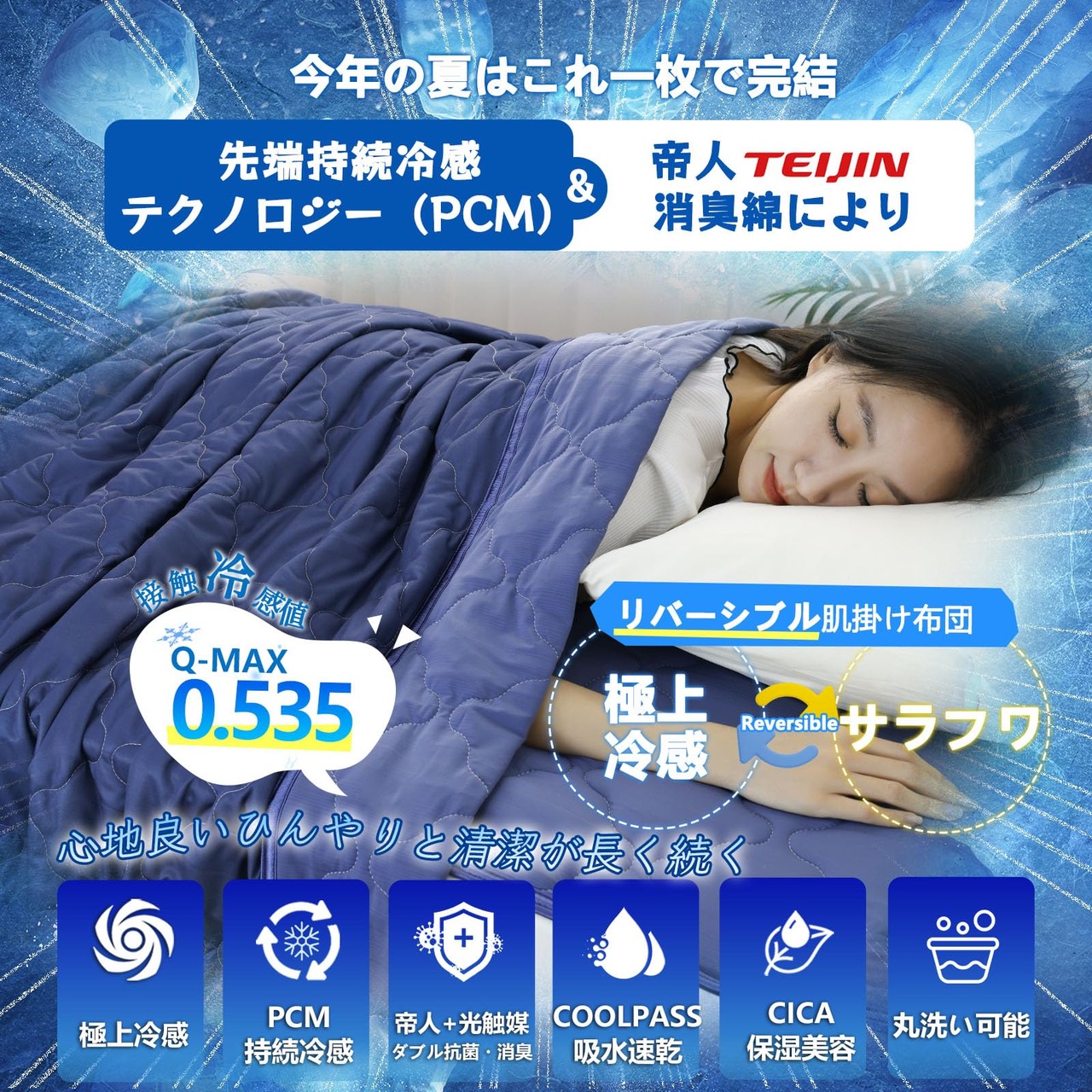 【新着商品】SunshineLife 夏用掛け布団 ダブル Q-MAX0.535✕PCM持続冷感 『帝人消臭わた+光触媒加工』2重抗菌 4大消臭 リバーシブル 肌掛け布団 CICA超柔保湿 冷感ニット面&Coolpass®超吸水速乾生地 敏感肌・子供向け 軽量 通気性 丸洗い 180×190cm(ネイビー)