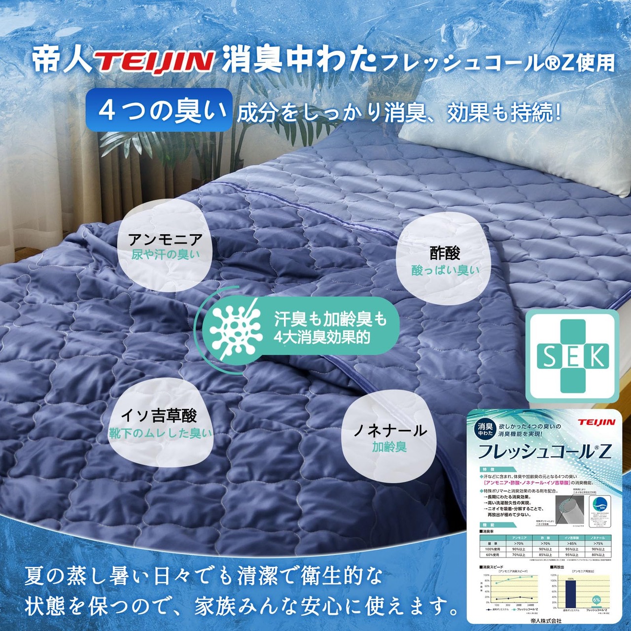 【帝人消臭中綿&光触媒制菌加工 ダブル抗菌防臭】夏用掛け布団は、帝人フレッシュコール消臭綿を使用しています。この中綿は汗臭や加齢臭など4大臭を効果的に消臭する優れた永久消臭機能を持ちます。さらに、光触媒制菌消臭加工された表地との組み合わせにより、ダブルの抗菌消臭効果を発揮します。夏掛け布団として、夏の蒸し暑い日々でも清潔で衛生的な状態を保ちます。