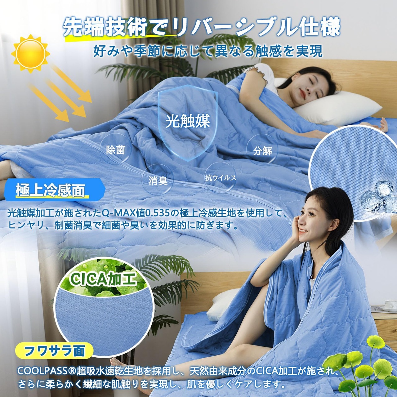 【厳選冷感素材 快適な体験を提供】夏用掛け布団はユニークな両面デザインを採用しています。一方は厳選されたナイロンとポリウレタン混紡の柔らかなスムース生地を使用して、光触媒制菌消臭加工が施されています。強冷感Q-MAX値0.535を保持しつつ、細菌や臭いを効果的に防ぎます。光触媒加工された生地は、日光や蛍光灯などの光に反応し、一般的な細菌、臭い、カビ、有害化学物質を分解して無害化します。汗や湿気による臭いや細菌を気にせず、いつでも清潔で爽やかな肌触りの肌布団を楽しめます!