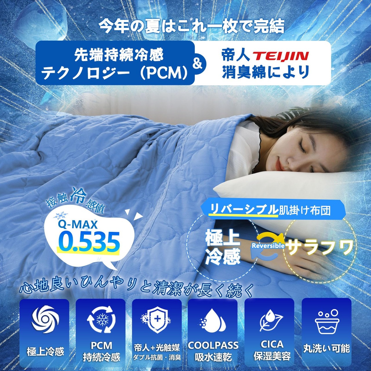 【人気商品】SunshineLife 夏用掛け布団 セミダブル Q-MAX0.535✕PCM持続冷感 『帝人消臭わた+光触媒加工』2重抗菌 4大消臭 リバーシブル 肌掛け布団 CICA超柔保湿 冷感ニット面&Coolpass®超吸水速乾生地 敏感肌・子供向け 軽量 通気性 丸洗い 160×190cm(ブルー)