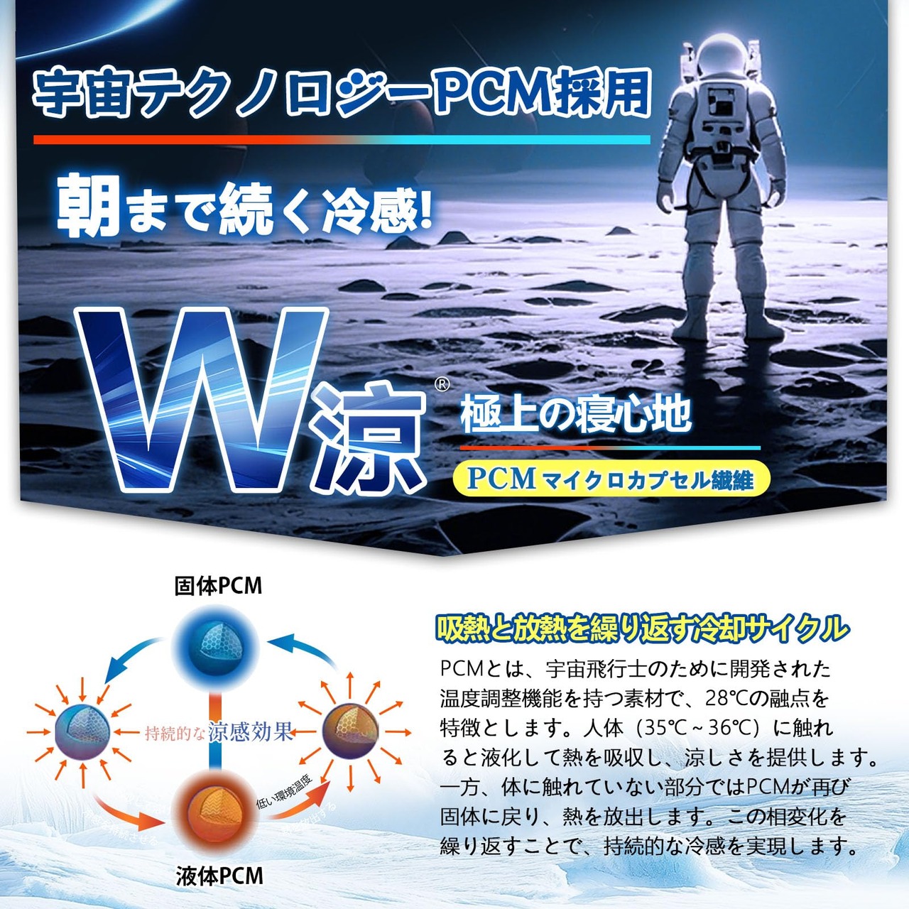 【宇宙レベルの温度調節機能 持続的な冷感を実現】夏用掛け布団の詰めものには、PCMマイクロカプセル繊維を採用しています。PCMとは、宇宙飛行士のために開発された温度調整機能を持つ素材で、28℃の融点を特徴とします。人体(35℃~36℃)に触れると液化して熱を吸収し、涼しさを提供します。一方、体に触れていない部分ではPCMが再び固体に戻り、熱を放出します。この相変化を繰り返すことで、夏用掛け布団は持続的な冷感を実現します。暑い夏の日でも、肌布団内の温度が効果的に調整され、快適な睡眠環境を提供します。これにより、従来の夏用布団よりも高い持続的な冷感を実現します。