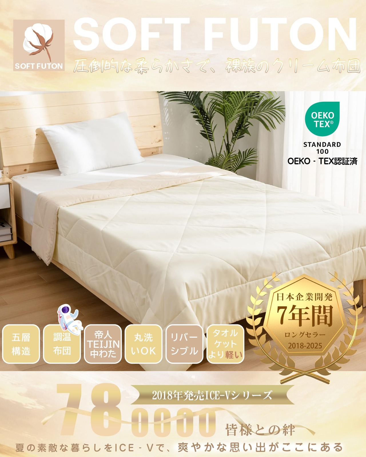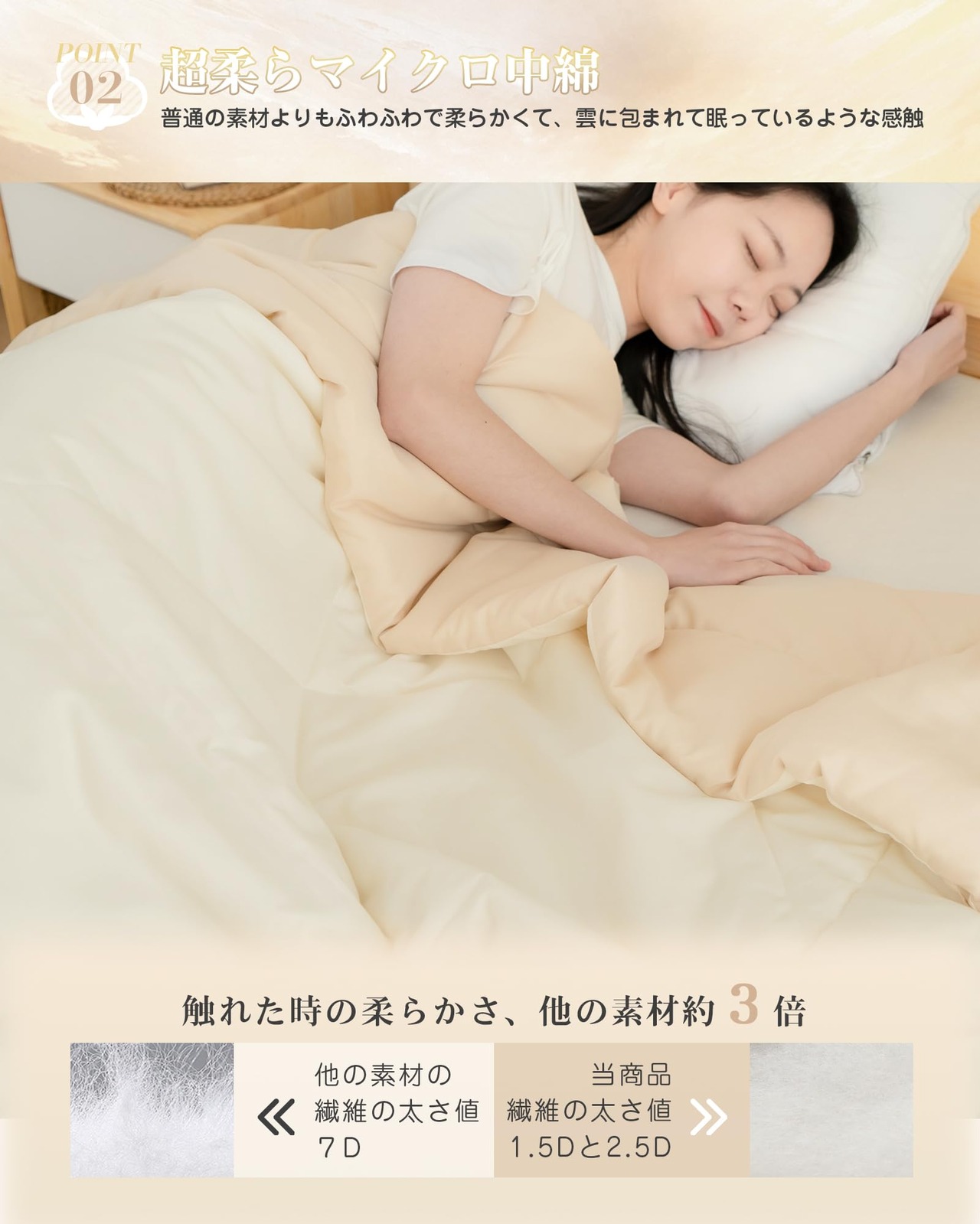 【5層構造・快適な温度が長~く続く!】①超柔ポリエステル生地+②超柔らか中綿+③TEIJIN高機能中綿+④VK Living独自の調温中綿+⑤ピーチスキン加工生地、2024年の新技術により、創造したこだわりの5層構造掛け布団です。春先から秋口まで長い期間使え、季節の変わり目には重宝します。