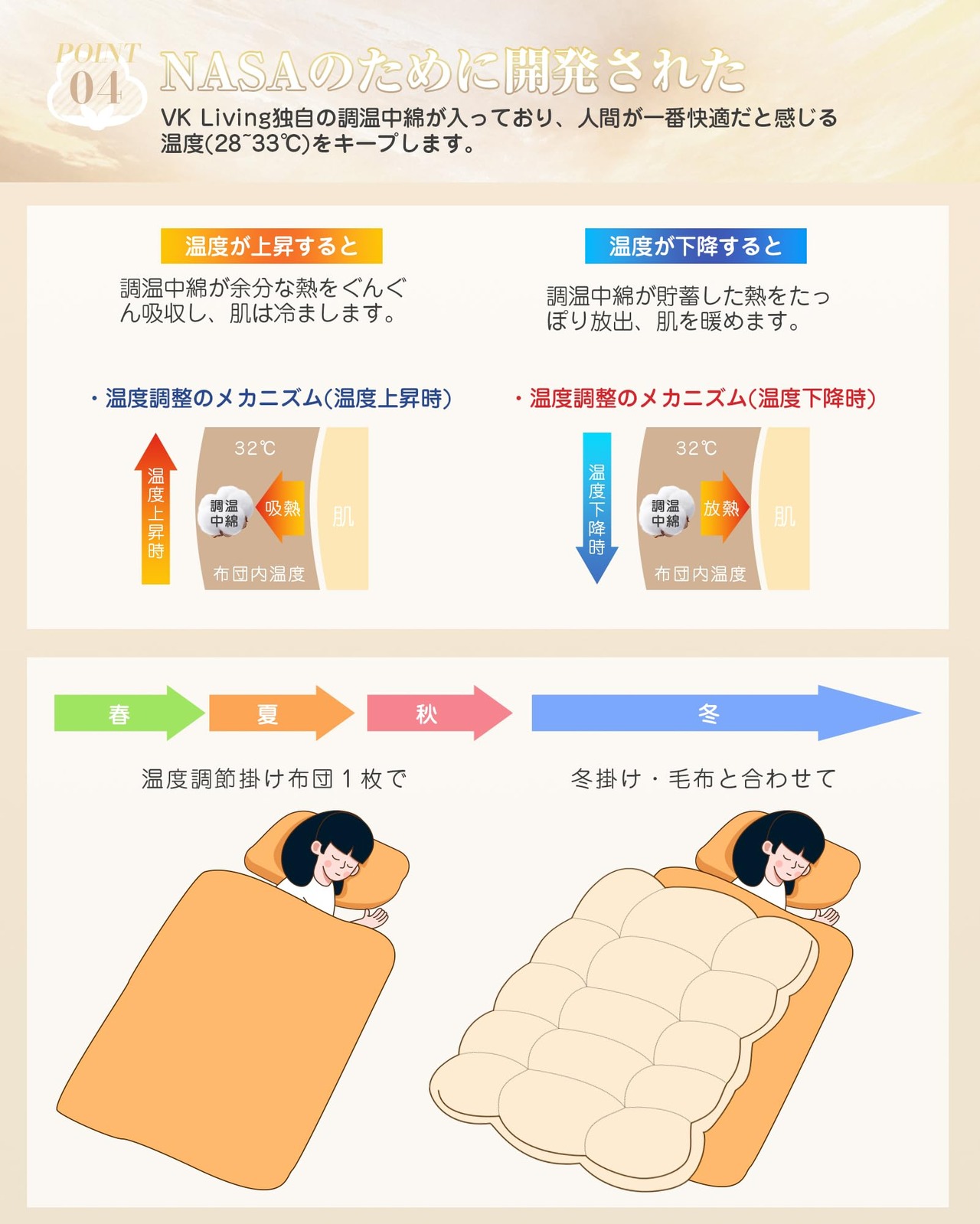 【オールシーズンで快適の秘密】NASAのために開発されたVK Living独自の調温中綿が入っており、人間が一番快適だと感じる温度(28~33℃)をずっとキープしようと働きかけます。暑い時は、熱を吸収し温度を下げて、肌を冷まします。寒い時は、熱を放出し温度を上げて、肌を暖めます。春・夏・秋は掛け布団一枚で快適。毛布と併用して、冬場もしっかり暖かい。
